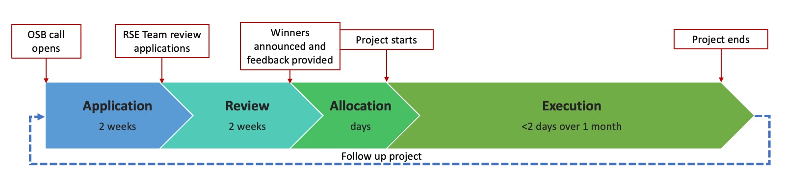 Image description: an image depicting the timeline for the OSB programme. Application phase, 2 weeks - OSB call opens. Review phase, two weeks - RSE team review applications - winners announced and feedback provided. Allocation phase, days -project starts. Execution, <4 days over 1 month - project ends.