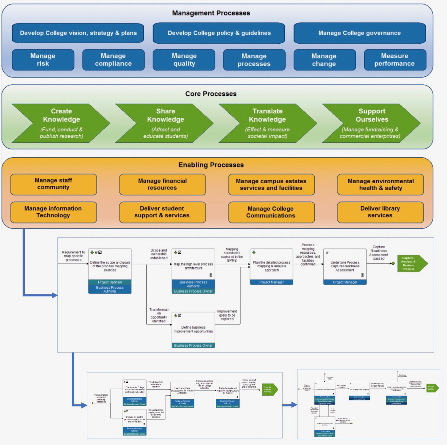 Mapping the College’s Process Architecture enables us to understand, visualise and optimise our business processes from a perspective that is independent of organisational and functional siloes. By bringing our processes into a shared Business Process Management System (BPMS), we can present them visually, make them widely accessible in College and establish a shared understanding that supports innovation, automation and continuous improvement.