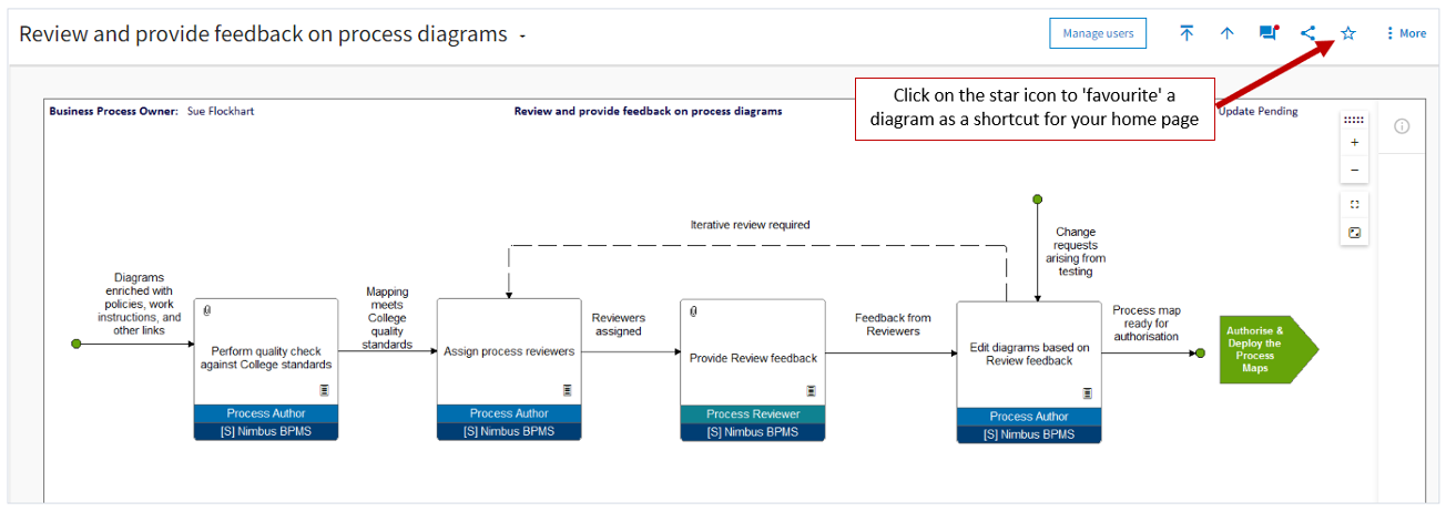 - Add favourites. Favouriting a diagram creates a shortcut to the process on your Nimbus home page. With a diagram open on screen, click on the star icon in the top-right-hand corner to add it as a favourite.