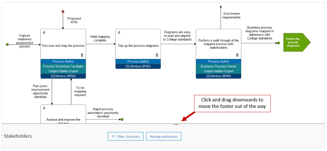 If the grey footer at the bottom of the screen is covering the lower part of a diagram, you can drag it out of the way by clicking on the tiny arrows in the middle of the footer and dragging downwards.