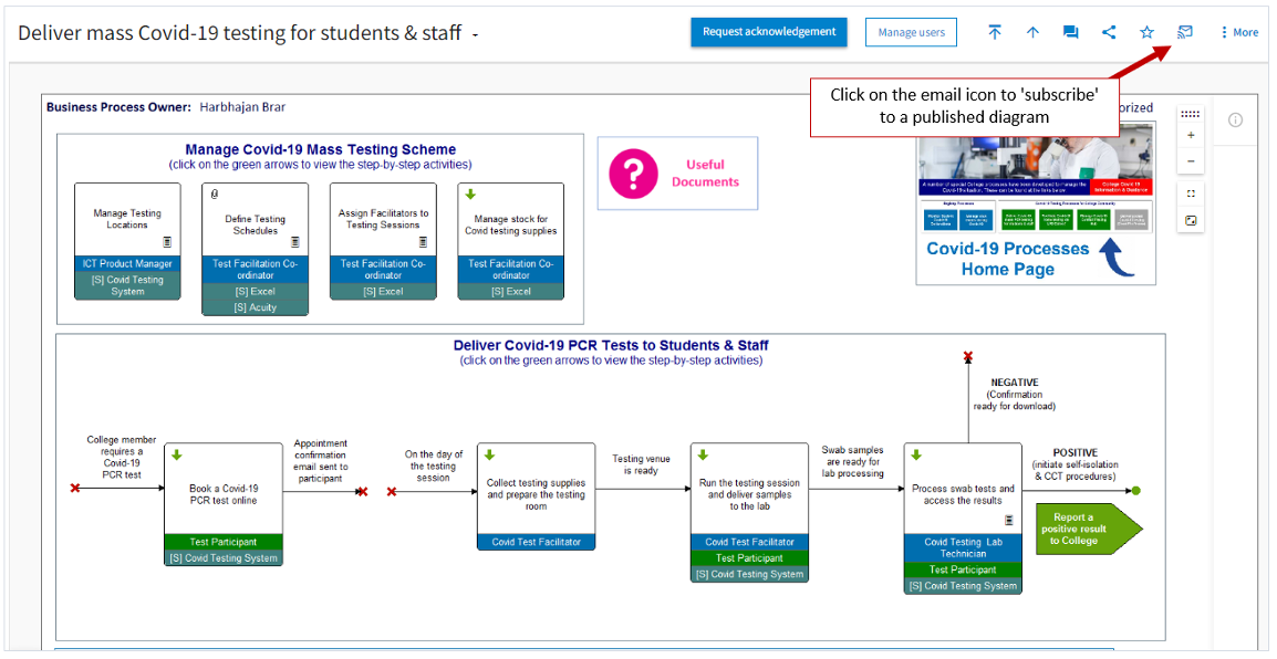 - Subscribe to a diagram. With a published diagram open on the screen, click the ‘Subscribe’ icon in the top right corner. If you are interested in more than one diagram within a process map, you must subscribe to each one independently.