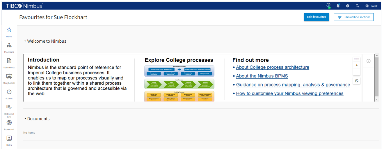 Some users are directed to a specialist landing page that brings together processes that are relevant to their job role. Others are directed to a general Nimbus home page, from which it is possible to browse the College’s shared mapping repository.