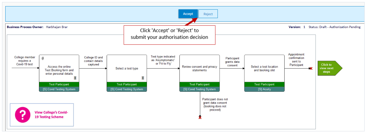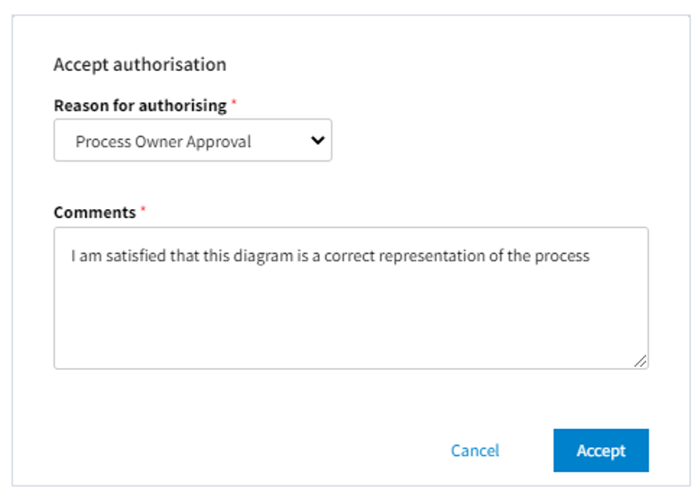 - When you are ready to submit your Authorisation response, scroll to the top of the screen and select either Accept or Reject. Indicate which type of authorisation you are giving (e.g. ‘Process Owner Approval’ or ‘Subject Matter Expert Approval’) and enter your authorisation comment.