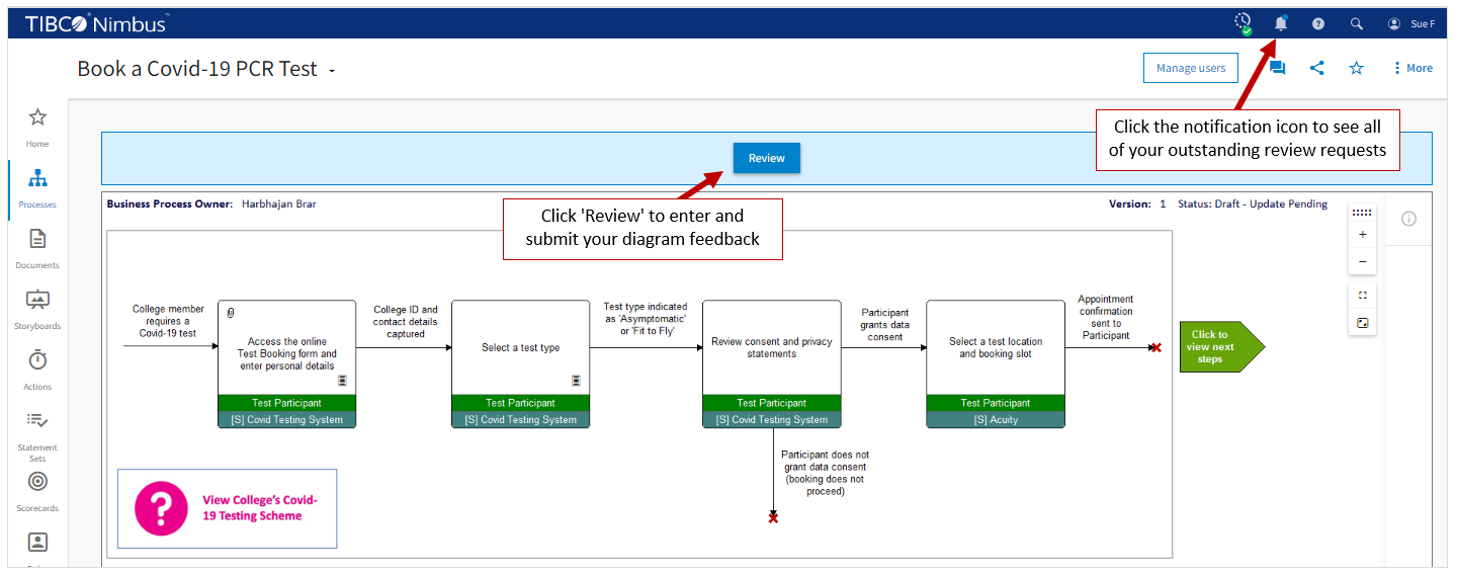 - Repeat steps 1-3 for any other diagrams that you have been asked to review. You can also view all of your outstanding review requests by clicking on the notification symbol in the top right-hand corner of the screen.