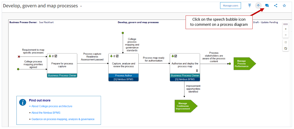 All users are welcome to provide ad-hoc feedback on process diagrams within Nimbus, using the Comment feature. Your comment will be notified to the Business Process Owner.