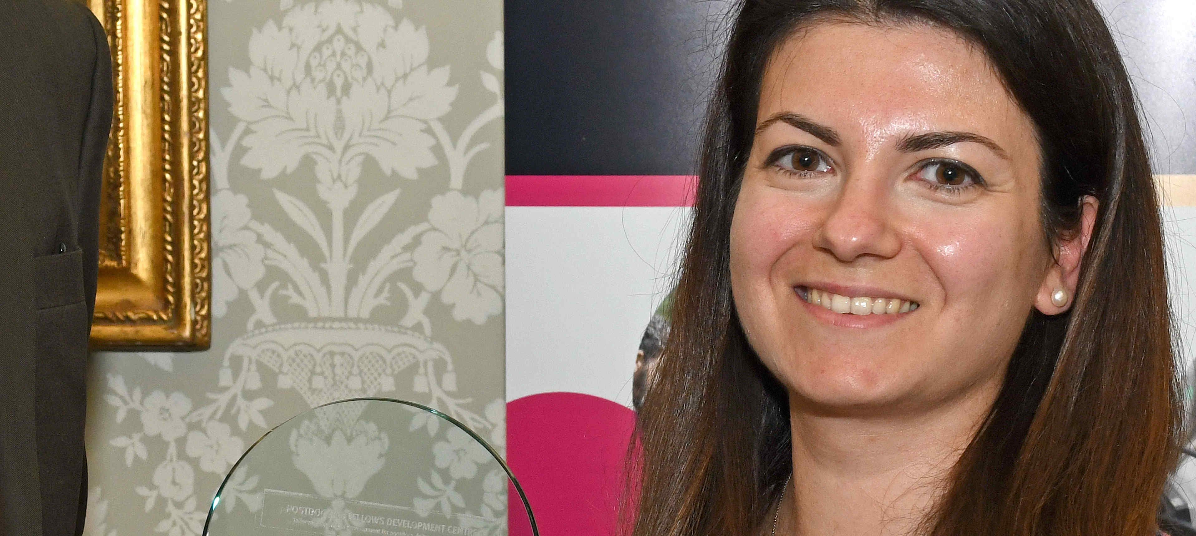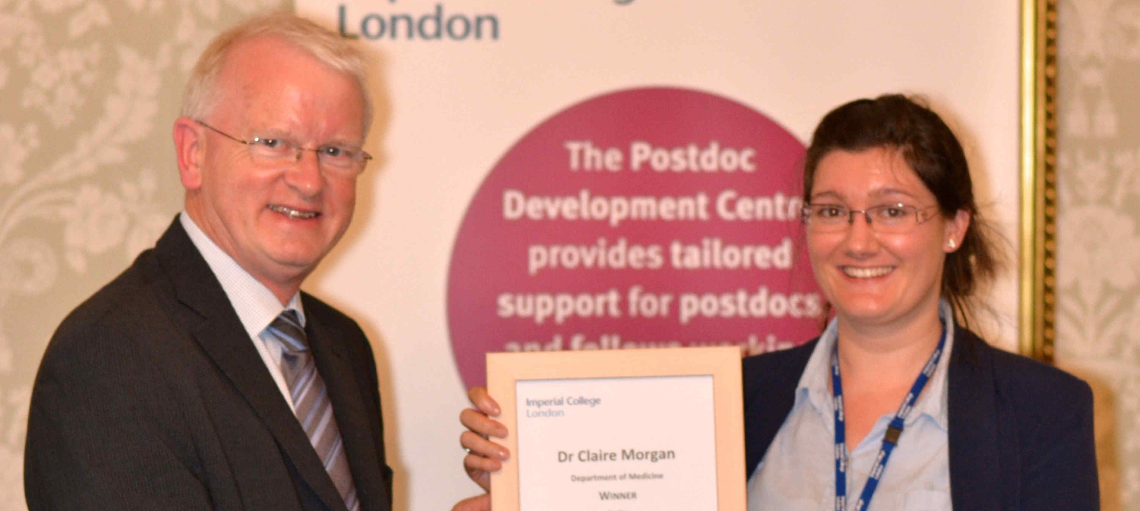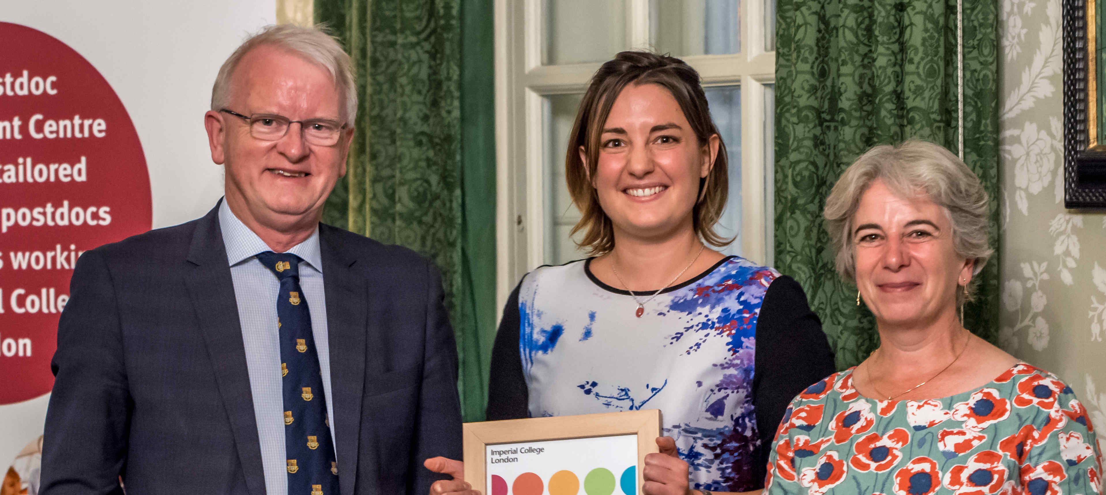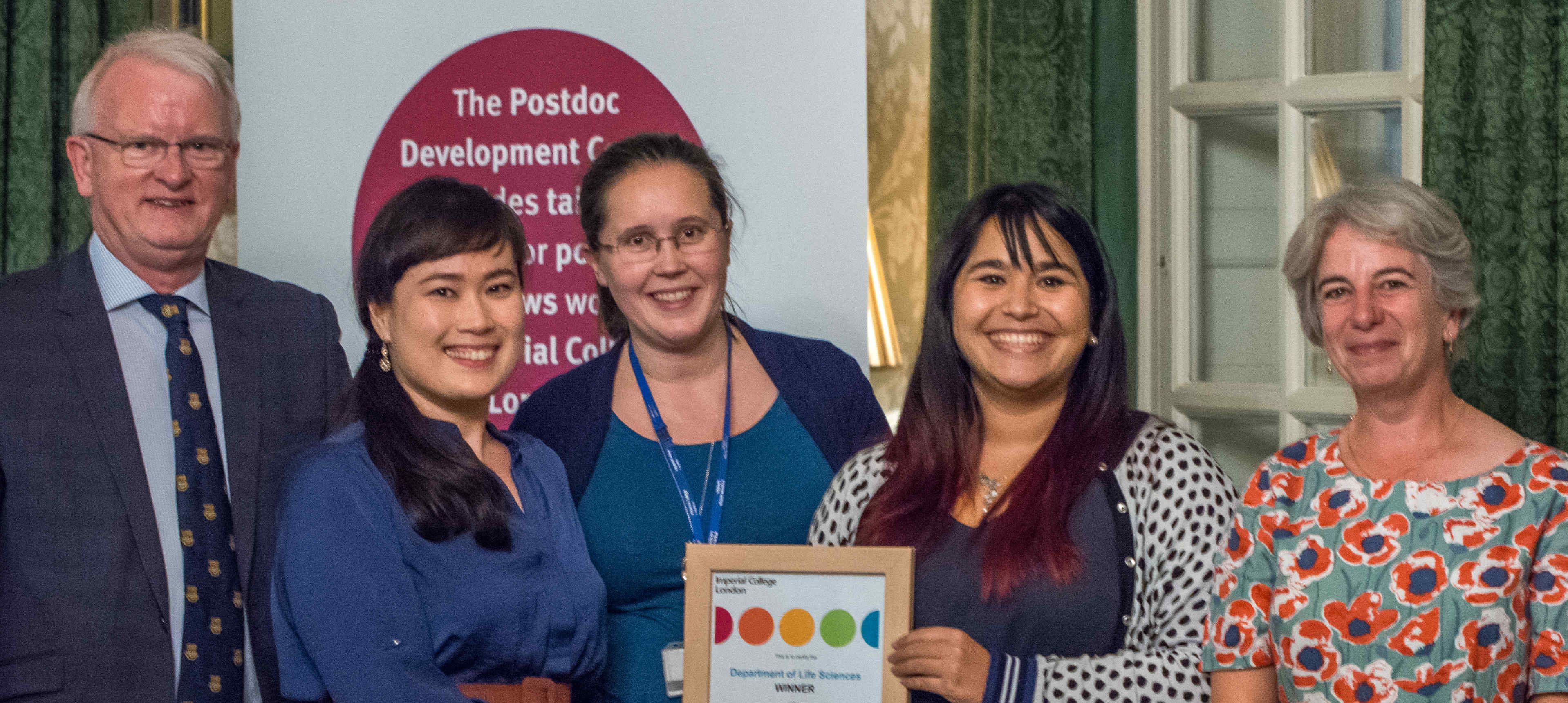 Front row: Dr Nina Moderau, Surgery & Cancer - Finalist, Dr Claudia Contini, Chemistry - Winner, Dr Alicia Estacio Gomez, Life Sciences – Finalist, Dr Kiron Athwal, Mechanical Engineering – finalist. Back row: Dr Liz Elvidge (Head, Postdoc and Fellows Development), Prof Ian Walmsley (Provost), Dr Karen Hinxman (Consulant)