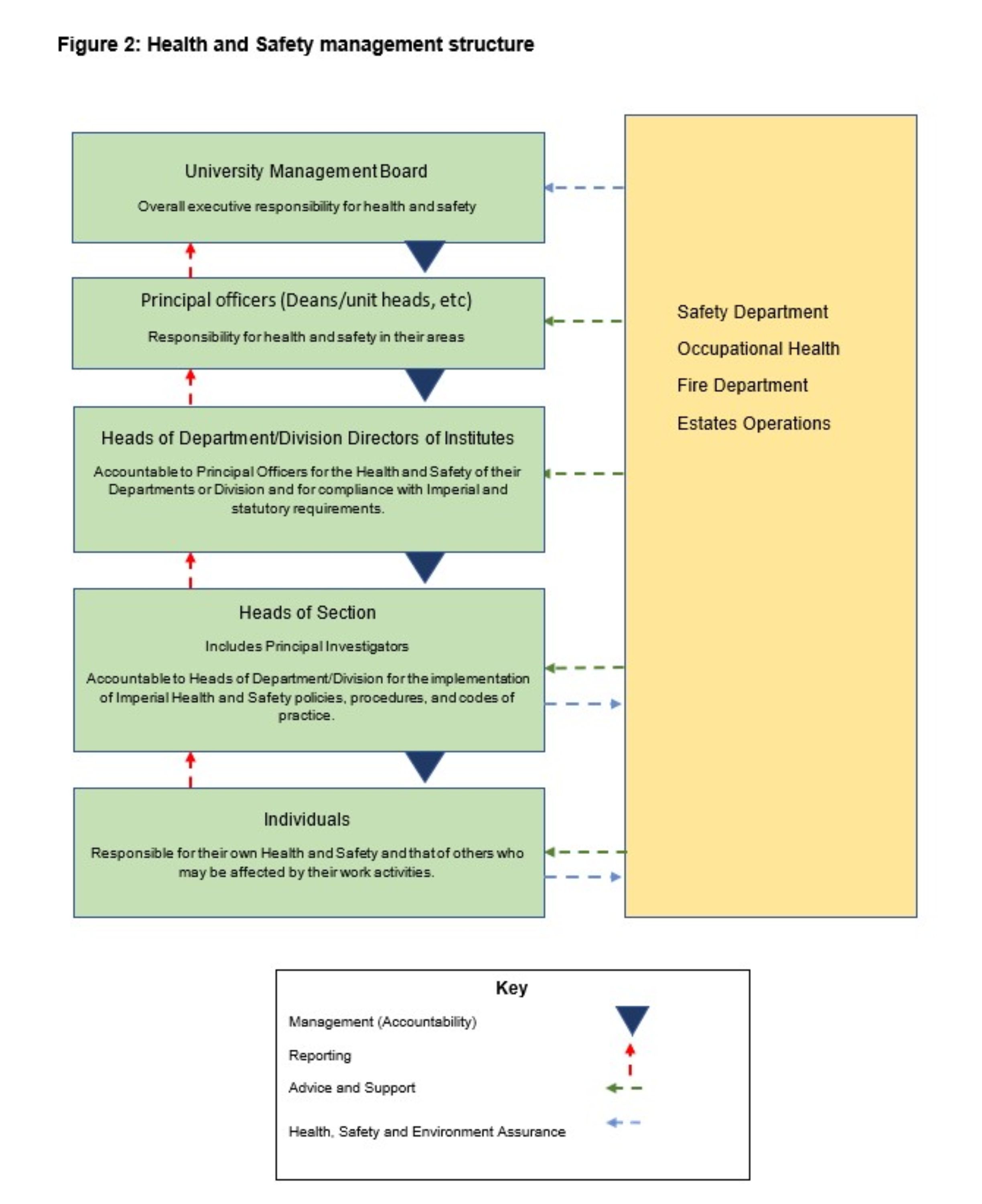 Imperial has defined HSE governance and management structures (figures 1 & 2) and oversight from the Council, to ensure that the University meets its duties of care, regulatory and legal requirements relating to Health and Safety. Each of these bodies regularly reviews performance, compliance, incidences, and risks, in accordance with their annual patterns of work.
