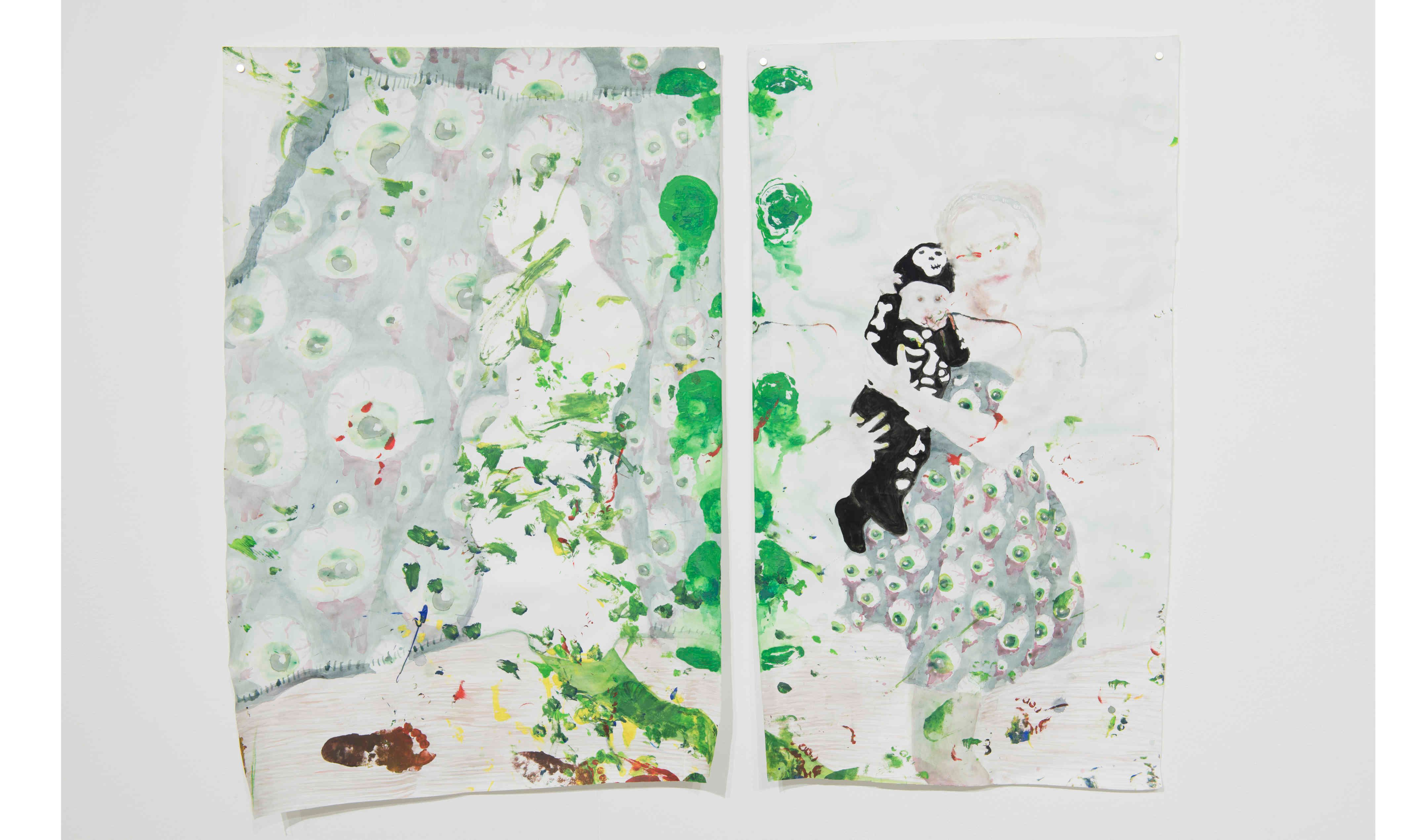 Mindy Lee is working on a new series of collaborative paintings and drawings on paper with her son J.A.L-B. Our first years together (with Mr Bones) combines personal memories with a reclamation of external medical information. They explore identity and memory through psychological and physical states. Paintings are layered through play paint games, imagery and prints to create a precarious fluctuation between abstraction and figuration. These games bear witness to J.A.L-B’s exploration of the page through his external bodily prints and gestures. His gestures are fetishized, reclaimed and mimicked, blurring the boundaries between his touch and Lee’s as a way to reconnect and fuse their (painterly) narratives. J.A.L-B’s marks transform and inform images which haunt beneath the surface. Bones are revealed as an internal reality and as a part of mortality. Bones are also used as costume, as prop and toy, bringing a hammer horror humour into play. Rorschach prints run throughout the series, referring to child’s butterfly prints and psychological evaluation tests. These prints appear both as severed ties between the diptychs and a large parental type totems guarding the small scale works.