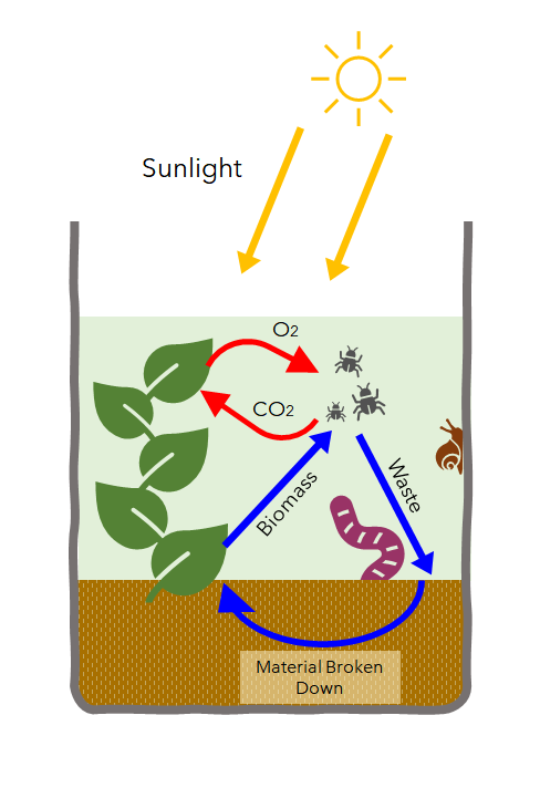 An Ecosystem describes how all the living (plants, animals, fungi etc.) and non-living (water, weather, terrain etc.) components of a place come together. Everything in an ecosystem is somehow linked to everything else in the ecosystem and disruption to the fine balance of an ecosystem can sometimes lead to it collapsing. In this experiment we’ll create our own mini-ecosystem and hopefully get to see some of the connections between plants, animals, water and soil in real life!