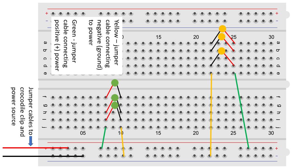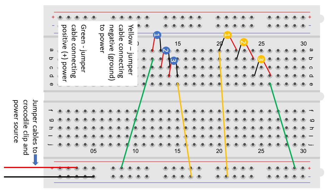 - To power the parallel circuit, connect the positive and negative power rails to any of the remaining two column options for (+) and (-), as you did with the series connection.