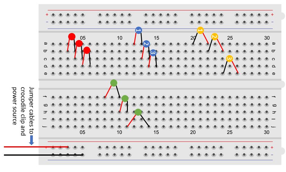 Below are four different sets (red, blue, yellow and green) of three LEDs in a series circuit - where the red leg represents the longer anode (+) leg and black the shorter, cathode (-) leg.