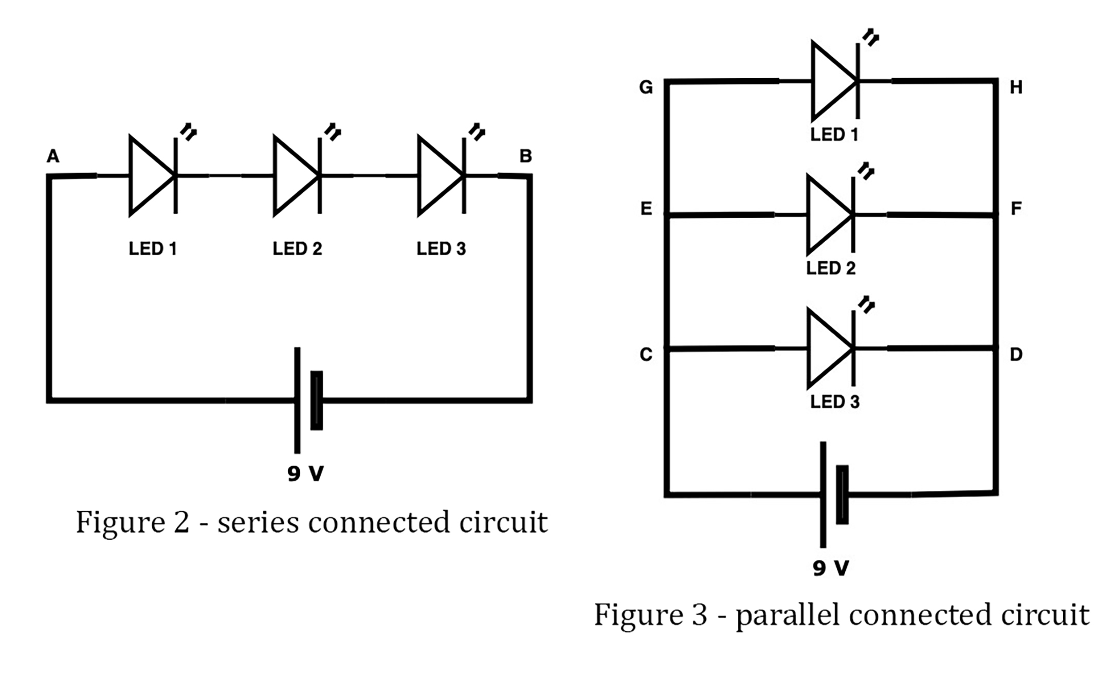 To build the series circuit, connect three LEDs in a series connection (connect the anode (+) of one LED (longer leg) to the cathode (-) of another LED (shorter leg). Standard practice is to start with the positive charge.