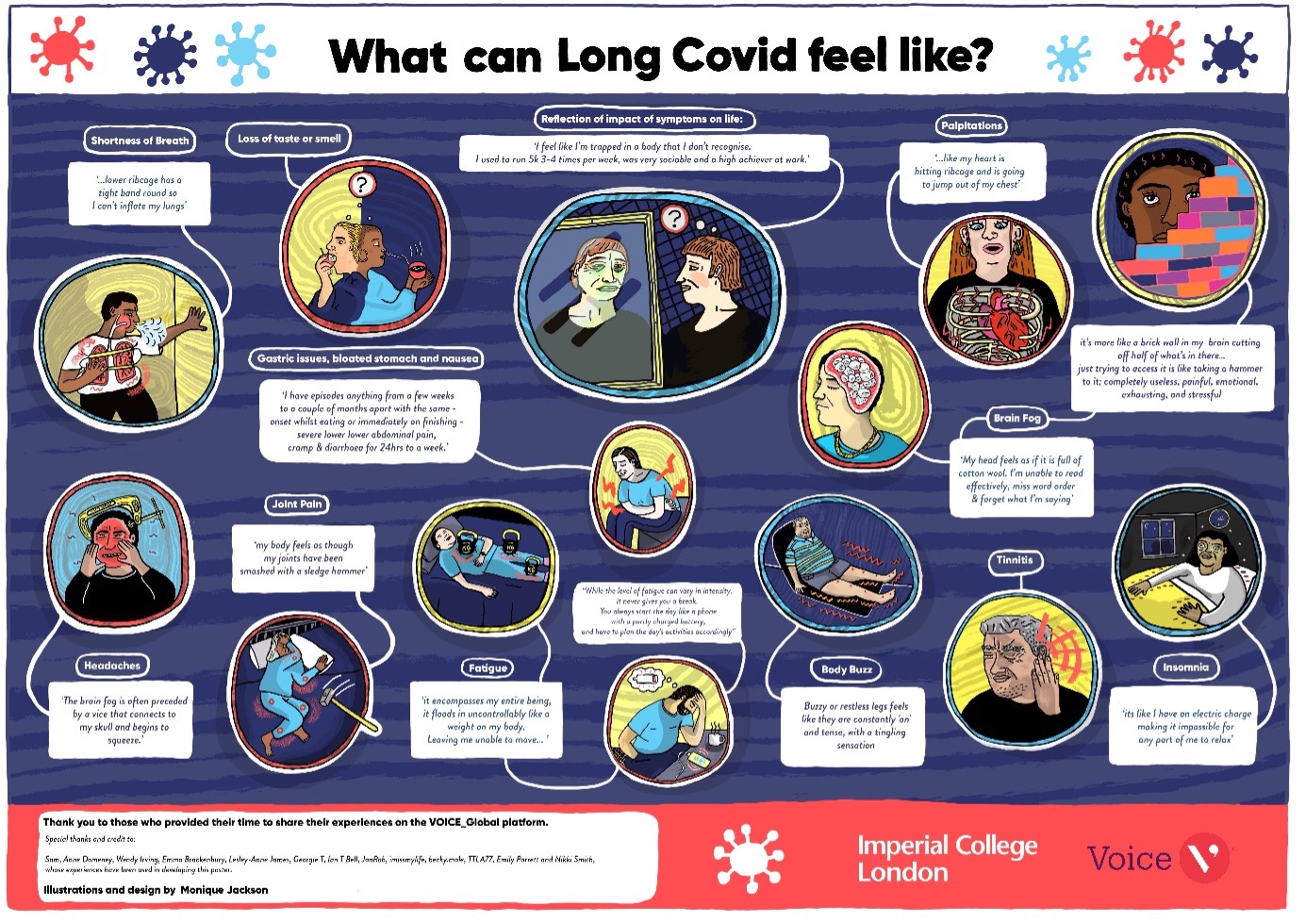 To achieve this, we have been working collaboratively with an artist who is living with long COVID (Still Ill Corona diary) to develop illustrations which visually capture the range and impact of Long COVID symptoms, e.g. what ‘fatigue’, ‘breathlessness’, ‘pain’, ‘tingling/buzzing’, ‘brain fog’ feels like.