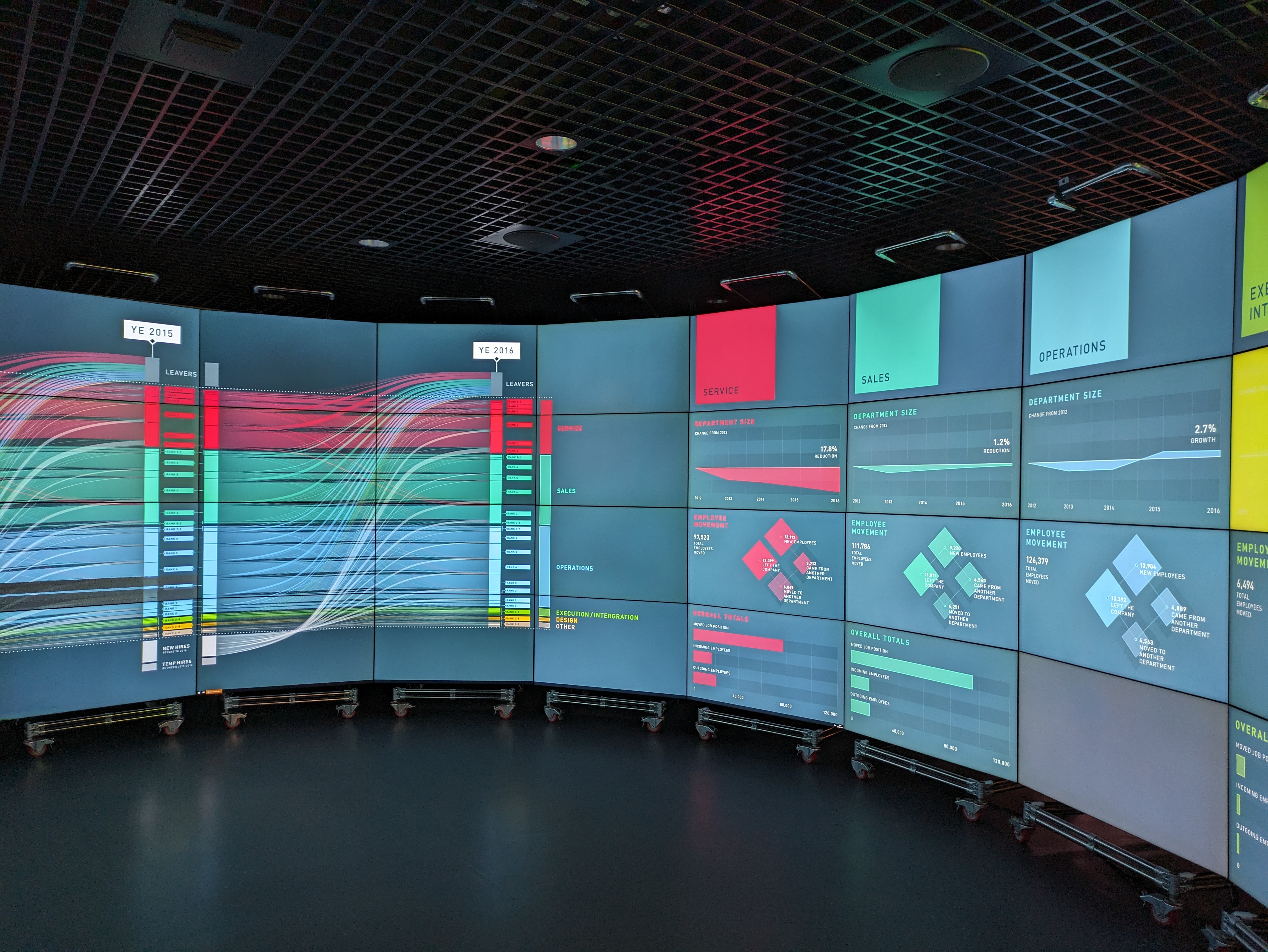 Visualisation that shows how employees in a bank moved between different departments within the company through several years. Data comprises biweekly HR record.