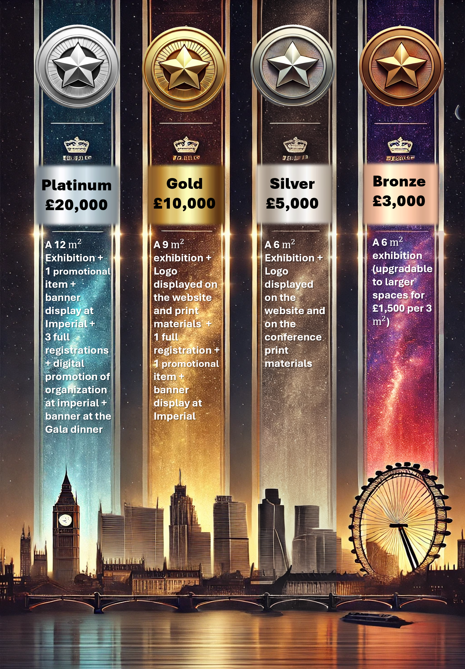 - Three full registrations (conference + Gala Dinner), digital organisation promotion at Imperial venues (electronic displays), banner at the Gala venue