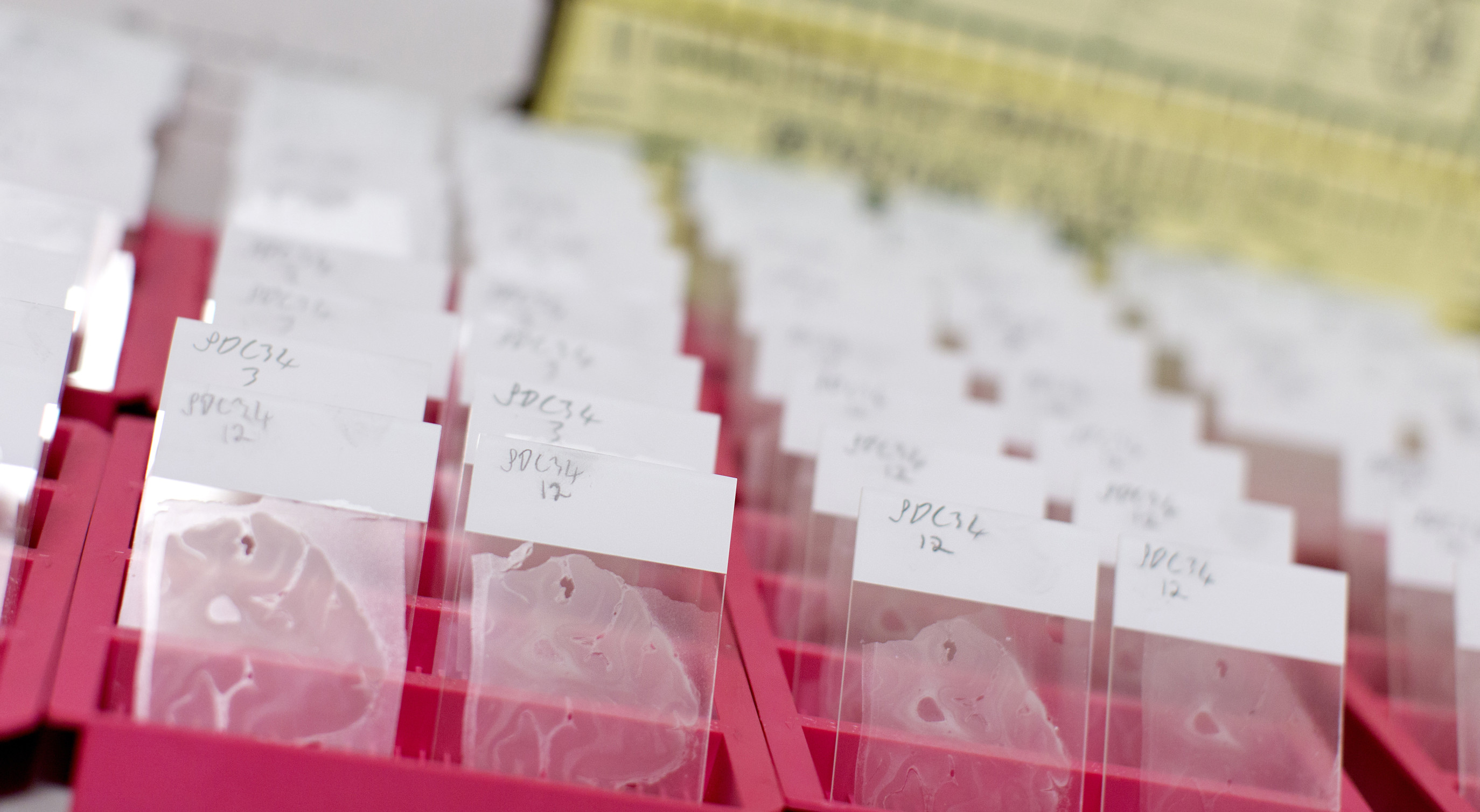 Unfortunately, most staining solutions are aqueous, so to stain the sections, the wax has to be dissolved and replaced with water (rehydration). This is essentially step 2 in reverse. The sections are passed through xylene, and then decreasing strengths of alcohol (100% to 0%) and finally water. Once stained, the section is then dehydrated once again, and placed in xylene. It is then mounted on the microscope slide in mounting medium dissolved in xylene. A coverslip is placed on top, to protect the sample. Evaporation of xylene around the edges of the coverslip, dries the mounting medium and bonds the coverlips firmly to the slide.