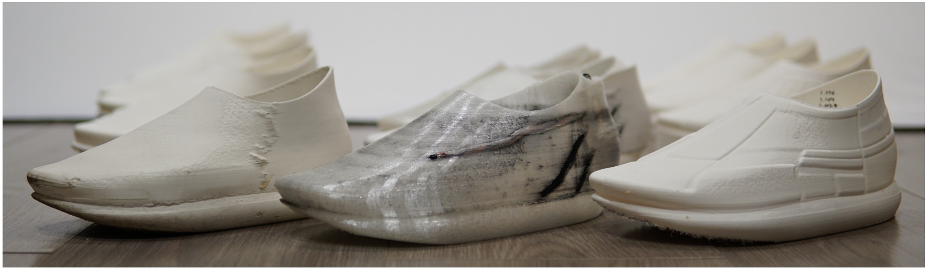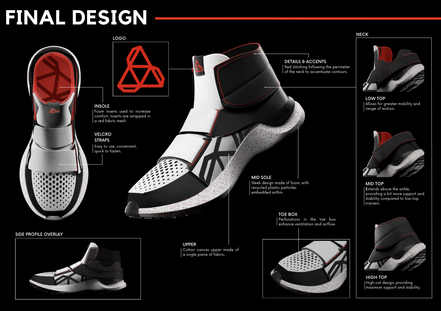 Every year, around 23 billion shoes are made of which 300 million are disposed of in the UK alone. Alongside this, large bills of materials, complex manufacturing processes and mass overconsumption in the shoe industry leads to excessive waste. Inspired by origami, the FOLDS shoe aims to tackle this issue by being made of a single net of material. It can be folded to change its style and function which simplifies manufacturing processes, and reduces material usage and costs.