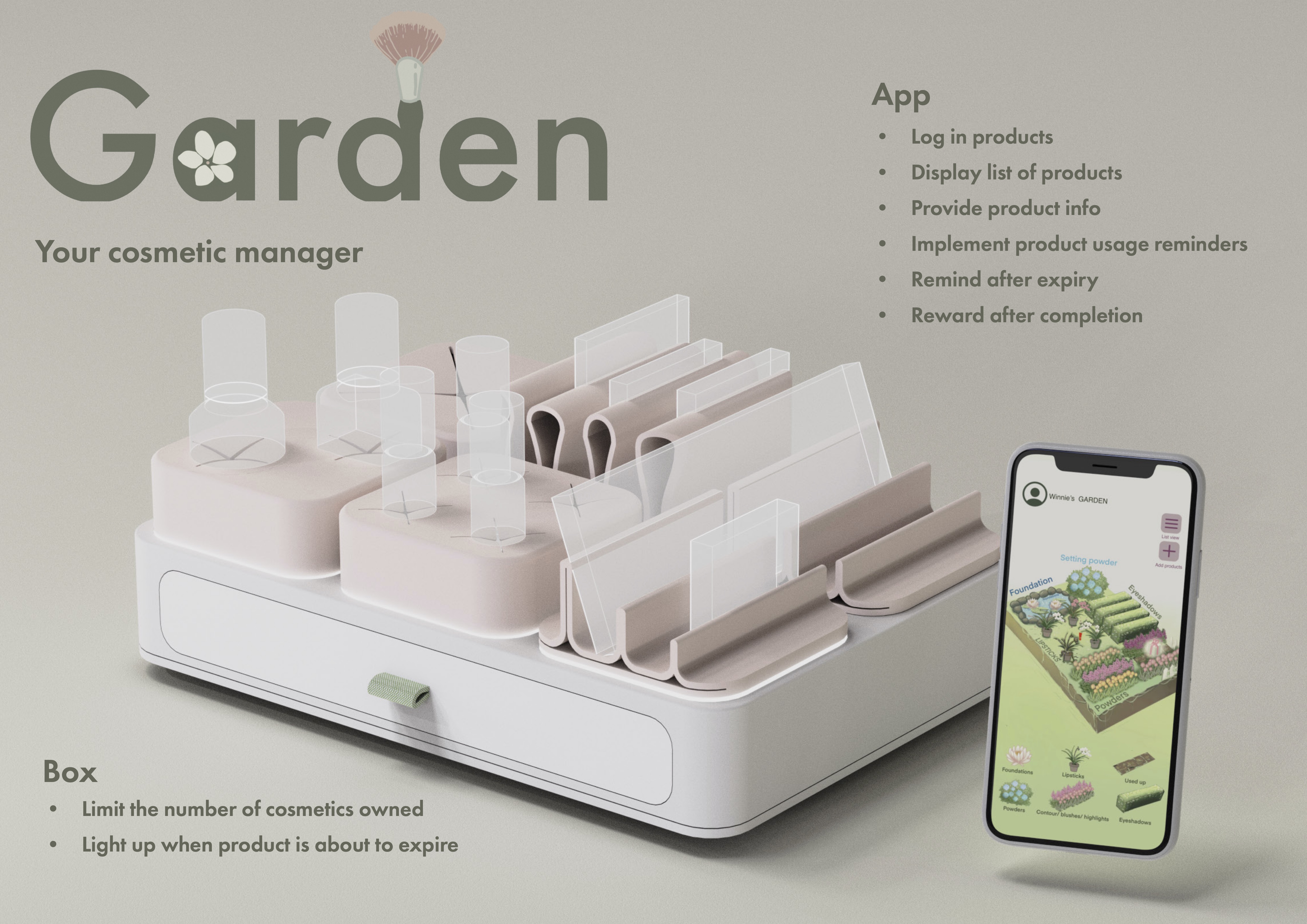 Garden addresses the issue of cosmetic wastage and over-purchasing in the face of increasing consumerism. It offers features aimed at reducing the uncertainty related to cosmetic expiration dates and helps users identify underused cosmetic products through a gamified approach. Garden is intended for users interested in adopting more sustainable lifestyle practices or finding it challenging to remember and manage their existing cosmetic products.
