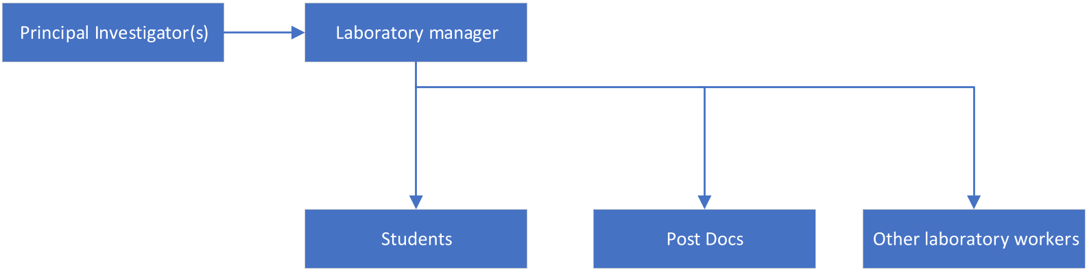 Every person working in the laboratory is responsible for their own personal safety and the safety of others working around them. On a day-to-day basis, the laboratory manager is responsible for ensuring all laboratory users adhere to all health and safety procedures applicable to the laboratory. The PI(s) is responsible for identifying the safety measures that should be in place and that the laboratory manager is correctly enforcing these measures.