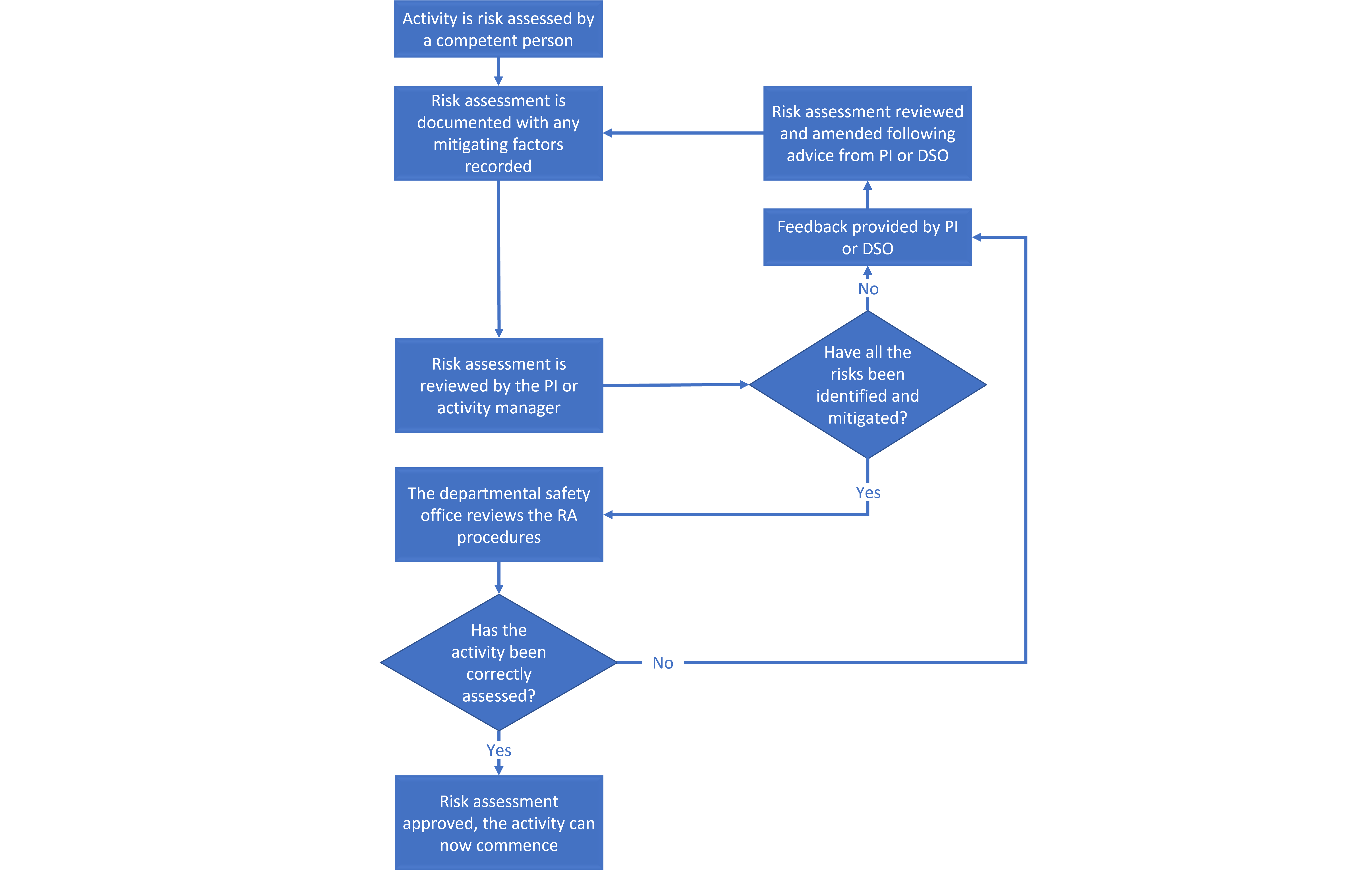 RA’s are normally carried out by the person(s) who will conduct the activity. This is then reviewed by a competent person such as a PI. The departmental safety officer will then carry out a final review to ensure that all the necessary assessments have been completed correctly.