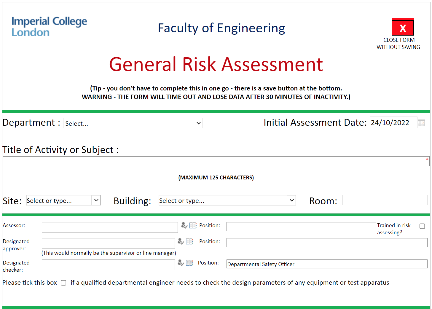 To help staff and students complete RA’s, ESE use an online general risk assessment tool. This provides a useful starting point for most laboratory and workshop-based assessments.