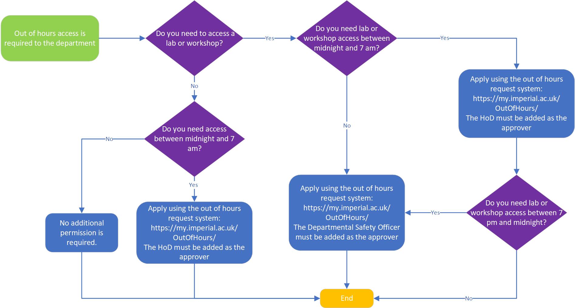 If you require out-of-hours access, you will need to apply through the out-of-hours portal. Use the flow diagram below to determine which permissions are required. Any questions, please contact the Departmental Safety Officer (DSO).