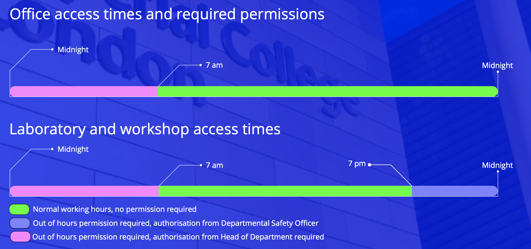 Access times to ESE buildings, office spaces, lecture halls and general areas are between 7am and midnight. Access to higher-risk areas of the department, such as laboratories and workshops, is between 7am to 7pm.