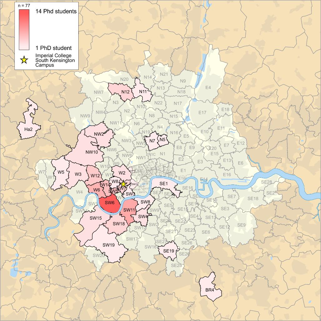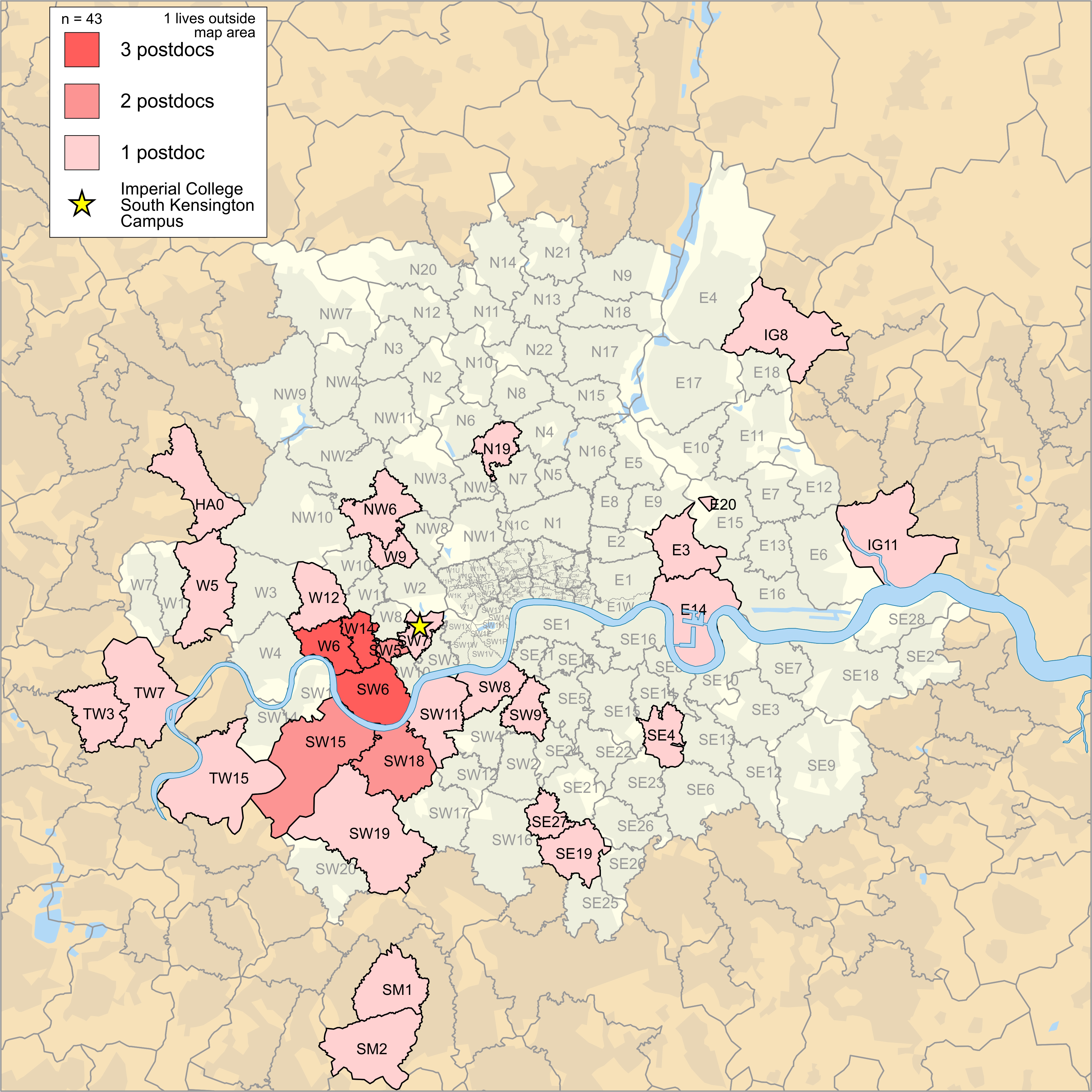 If you are new to London you may not be sure where to live. There are many different boroughs, some of which have better transport links than others, some are very expensive and out of the reach of all but the super rich but some of the cheaper places to live are less desirable. To provide a starting point for your search for a home the maps below show the boroughs where our PhD students, postdocs and academic staff live. The academic staff map also shows where those with families live.