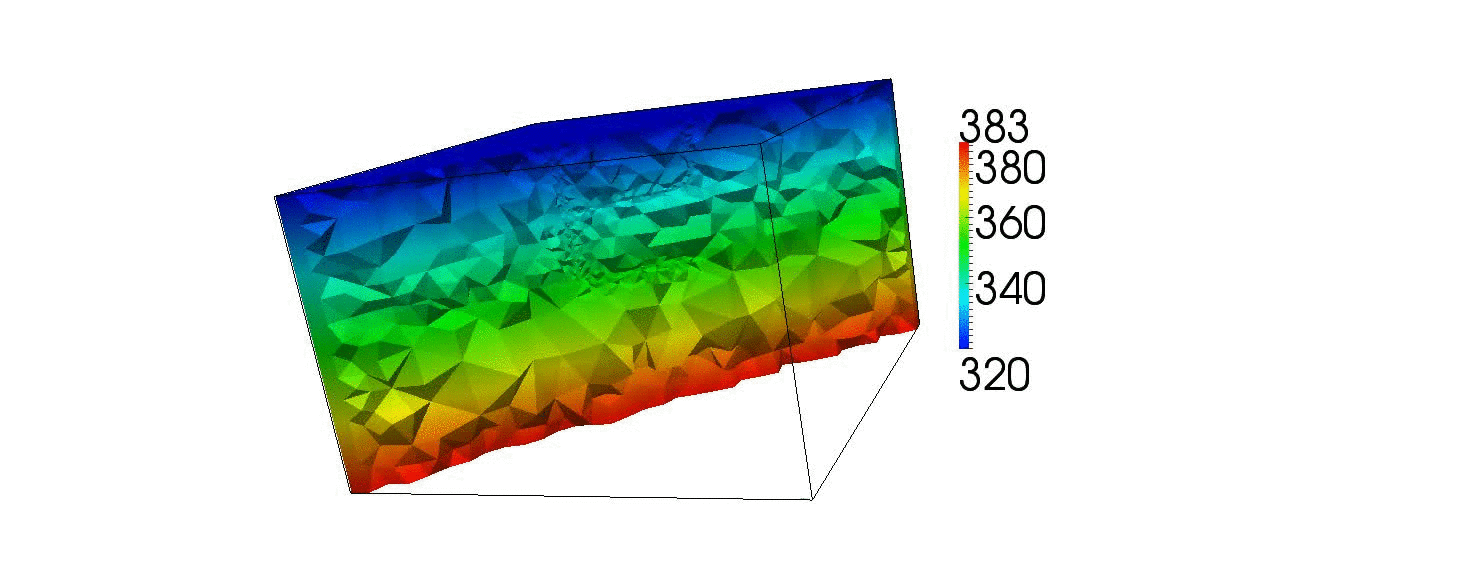 Cut through animation of a 3D numerical simulation using IC-FERST. The model simulates cold water injected into a hot reservoir and produced from a horizontal well pair. Colours denote temperature. Dynamic unstructured mesh adaptivity is used to capture the cold water front moving into the reservoir.