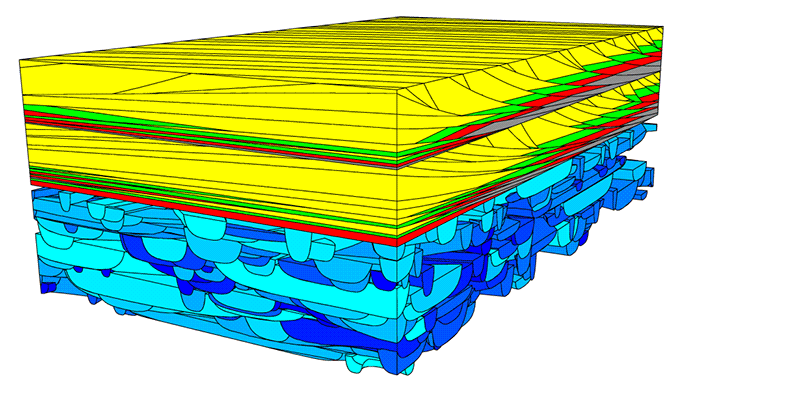 The model below is a surface-based representation of two stacked shallow-marine parasequences overlying a non-marine fluvial interval, created using IC-SURF. Dipping surfaces in the overlying parasequences represent clinoform surfaces. The varying colours represent different facies (rock) types. The model is entirely parametric; there is no underlying grid or mesh. This type of model is a typical input to the Imperial College Finite Element Reservoir Simulator (IC-FERST).