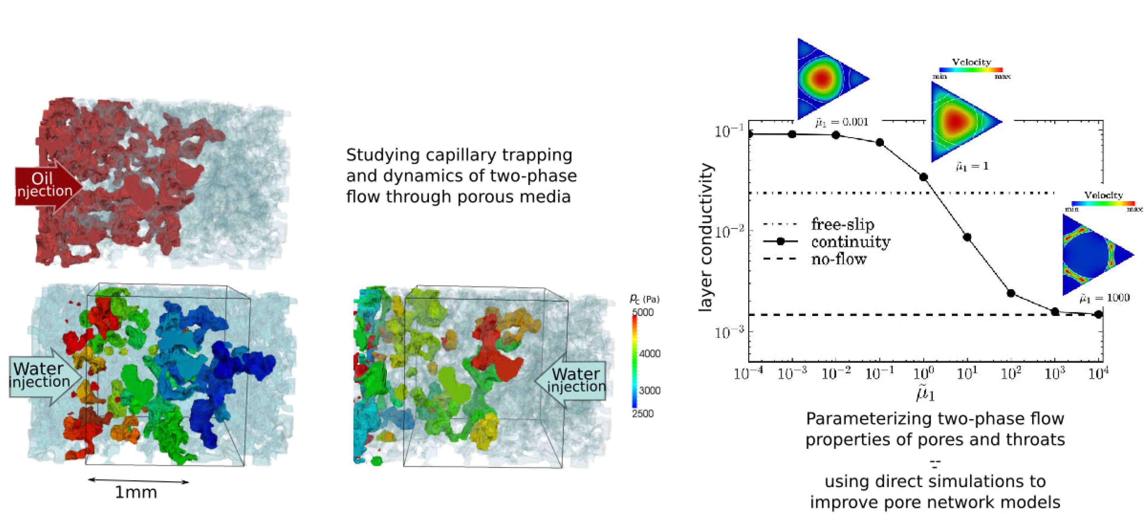 The Imperial College Consortium on Pore-Scale Modelling and Imaging uses innovative methods to image rock samples at micron resolution, and the fluids within the pore spaces, at reservoir conditions of temperature and pressure. These images are analysed in combination with averaged measurements of pressure differential to obtain both a pore-scale understanding of displacement processes as well as averaged properties, such as relative permeability, curvatures, contact angles, interfacial areas, connectivity and capillary pressure. The second main strand of our research is to develop a suite of modelling tools – including direct simulation and pore network modelling – to interpret and predict our results, and to explore behaviour outside the range of conditions studied experimentally. We study multiphase flow in porous media, the effects of wettability and reactive transport.