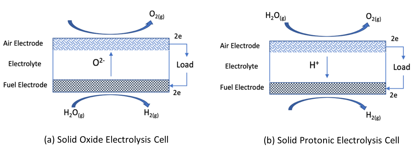 Figure 1: Comparison of a) solid oxide and b) solid protonic electrolysis cells