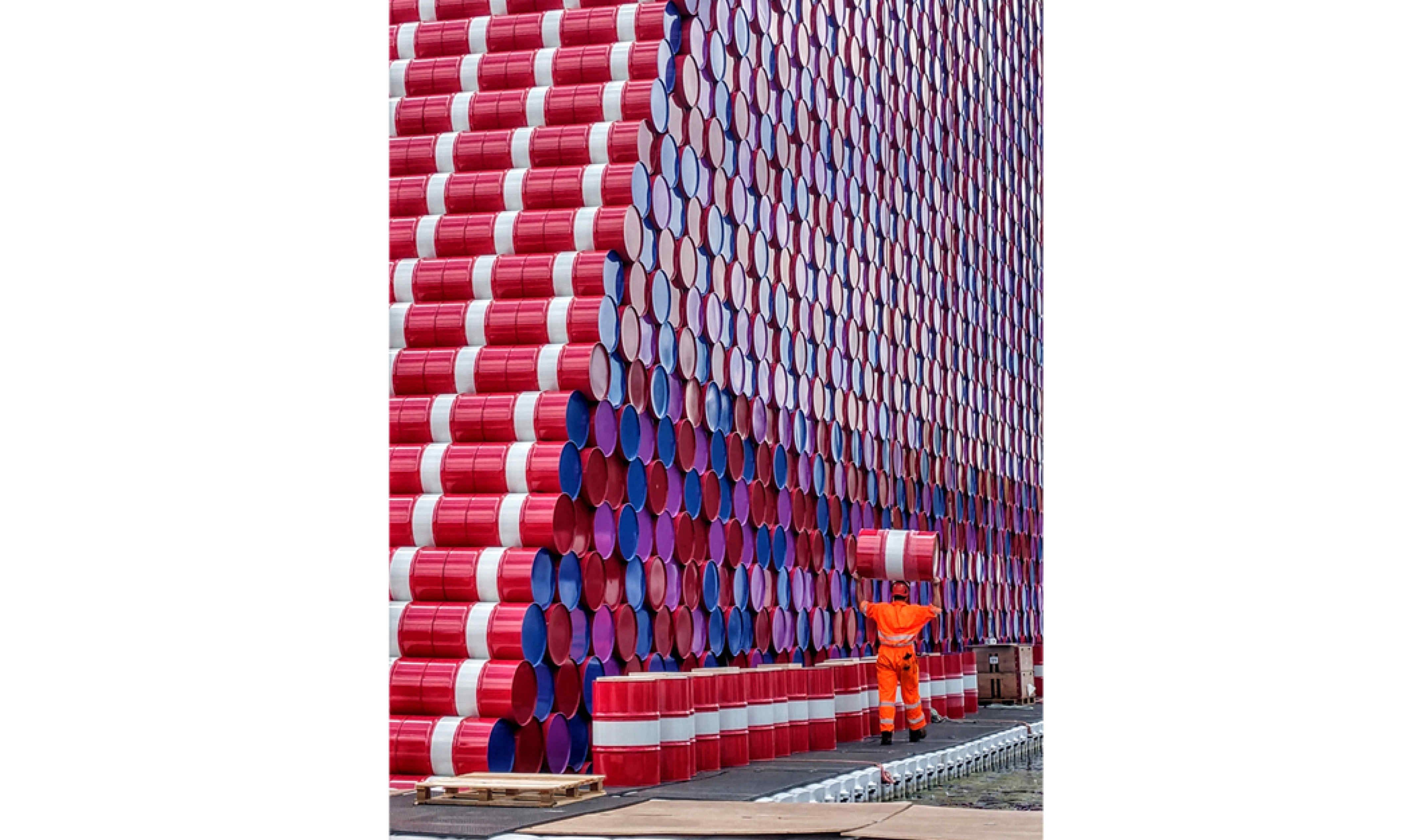 "A technically accomplished photograph that uses graphic composition to show a close up of a current story, the Christo Mastaba in the Serpentine. The inclusion of a worker building the sculpture focuses the viewers’ attention on the engineering aspects of an art work and also offers a perspective on the sculpture that is not often seen in the tourist photographs of the completed work floating on the Serpentine."