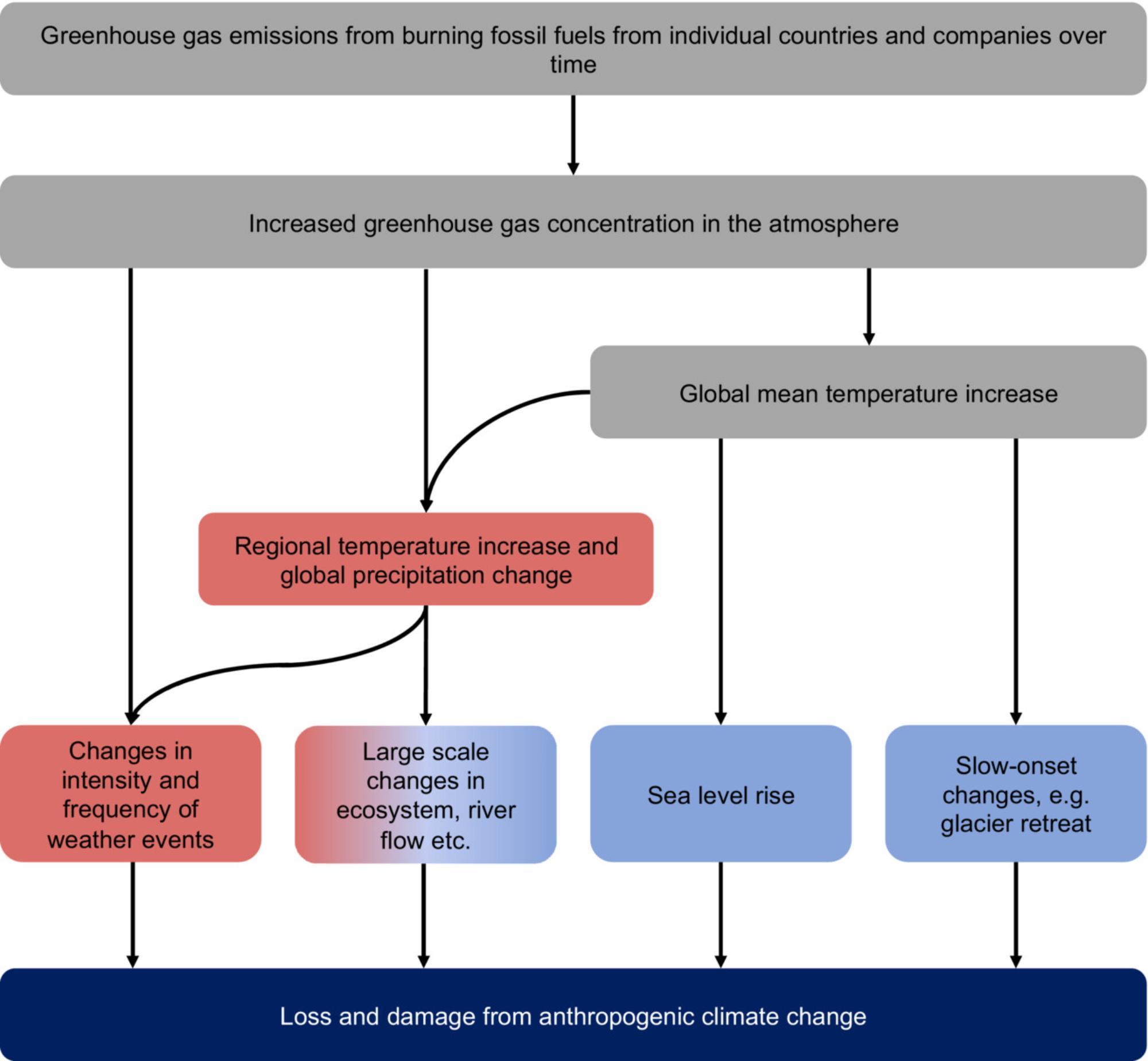 Human-caused climate change causes loss and damage in a variety of ways, ranging from events that are seen on an immediate timescale, such as extreme weather events (shown in red in figure 1), to those that have a lagged time response, such as sea level rise (shown in blue in Figure 1).