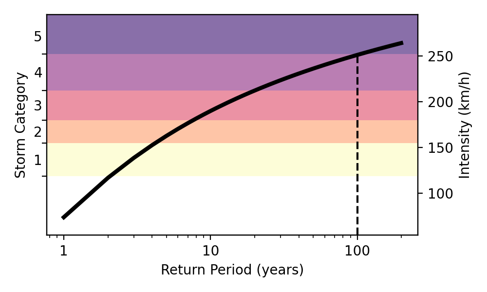 Figure 2. Illustration of the return period to understand the pop-ups in Figure1. In this example the dashed line shows a 100-year event would correspond to a Category 5 storm.