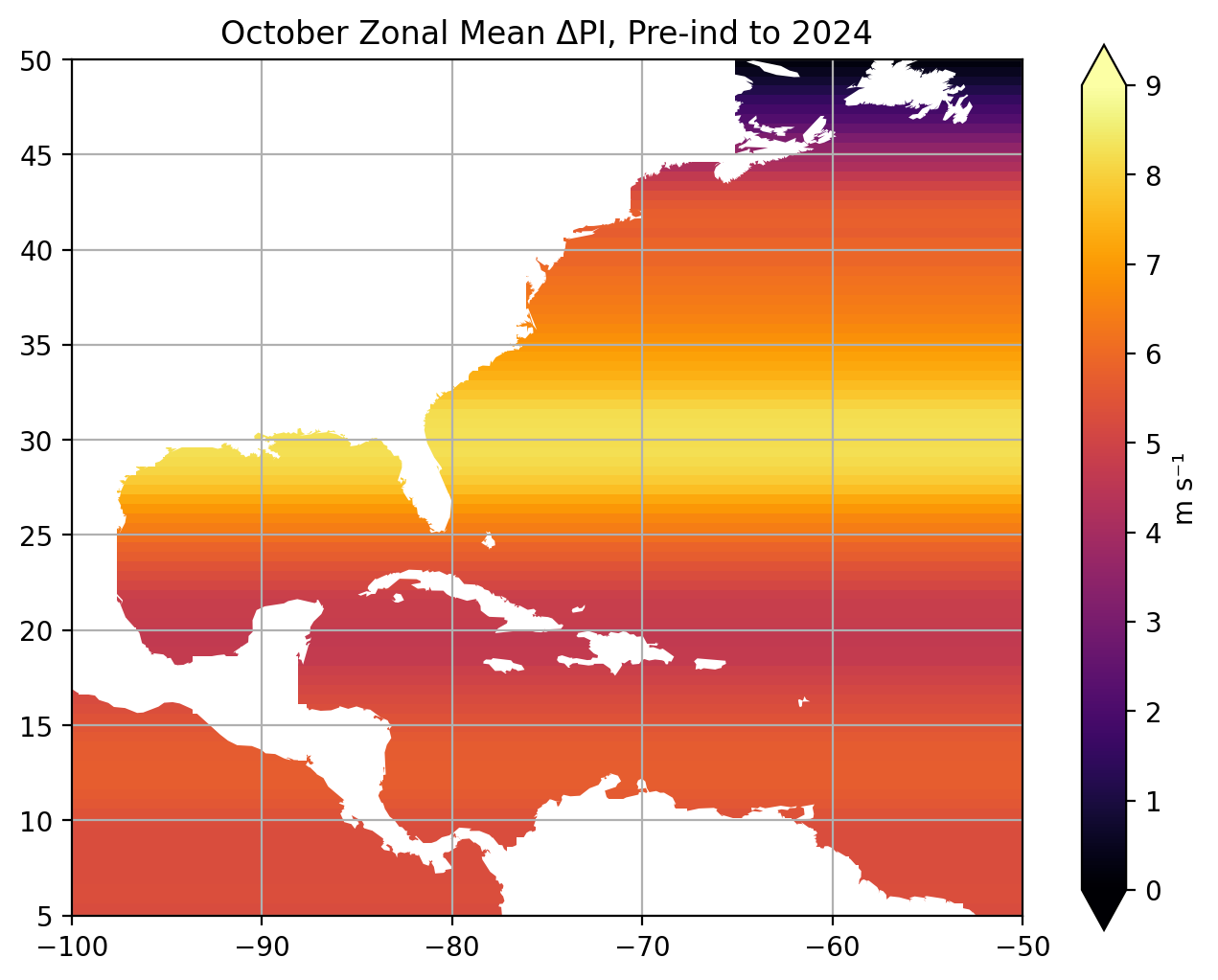 The pre-industrial state is equivalent to the global mean surface temperature of the 1950s. The pre-industrial value of PI is determined by regressing ERA5 backwards in time. Figure 1 shows the zonal mean difference in October PI between 2024 and the pre-industrial estimate. There are large trends in the tropics which decline towards the subtropics and then increase again at larger latitudes. This meridional structure is interesting and is different to the SST trends which tend to gradually increase from the tropics to higher latitude. The difference in pattern between PI and SST is caused by the important role of moisture trends. The PI difference between 2024 and pre-industrial is about +6 m/s in the Gulf of Mexico.