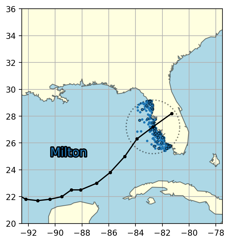 Figure 2. Simulated and observed event locations in the vicinity (2 degree radius) of Milton landfall. |