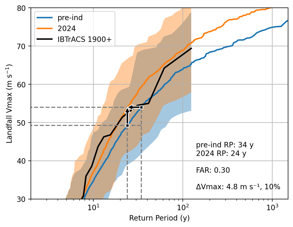 Figure 3. Landfall wind speed vs return period for the vicinity (2 degree radius) of Milton landfall as calculated for the current climate “2024” (range line), pre-industrial (blue line) and the observed climatology (black line). Shading indicates the uncertainty of the model based on individual 124-year simulations out of a total of 10,000 simulation years. FAR is the Fractional Attributable Risk (Equation 1) of landfall with a maximum wind speed of 54 m/s. |