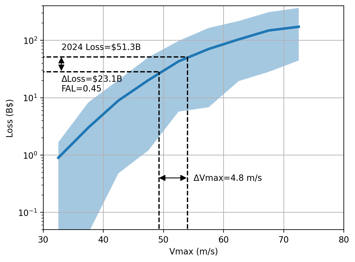 Figure 4. Economic loss vs maximum wind speed for the vicinity (2 degree radius) of Milton landfall. FAL is the fractional attributable loss for the intensification due to climate change (Equation 2). Line shows the mean and shading shows the 10%-90% percentile range. |