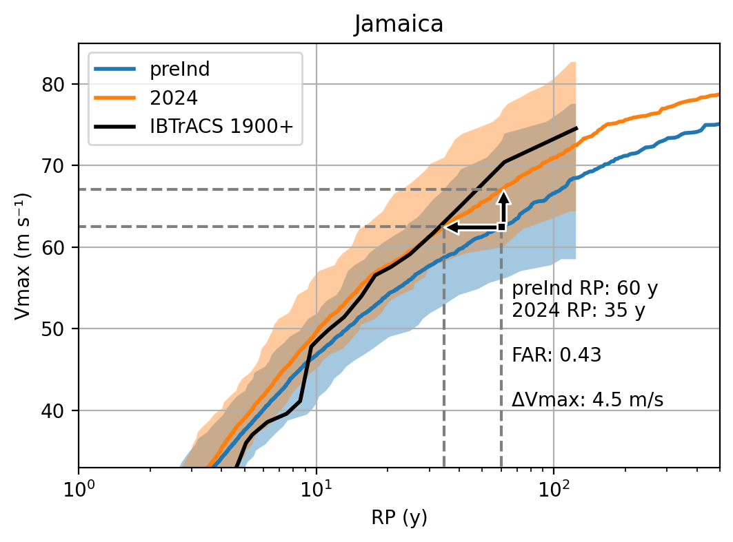 The intensity of a Beryl type event was increased by about 4.5 m/s or 7% (Figure 3) – a change from the middle to nearer the top of the Category 4. From this we can also determine that the likelihood of this type of event near Jamaica has changed from an event expected on average once every 60 years to once every 35 years (Figure 3).