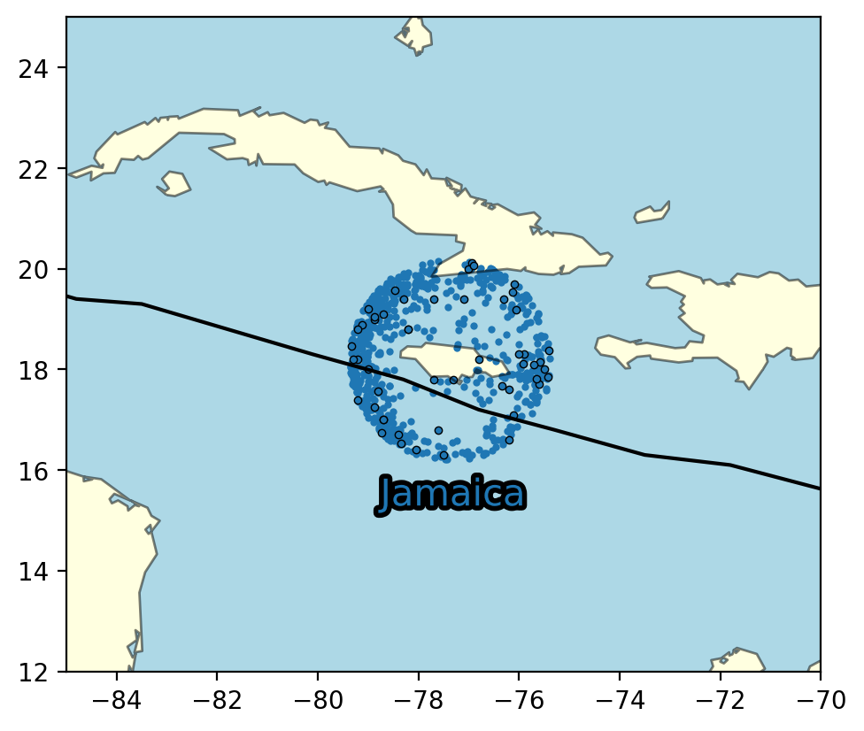 Figure 2 - Events contributing to the attribution analysis. Black circles show the location of the maximum intensity of tracks of observed hurricanes which pass within 2 degrees of the centre of Jamaica. Blue dots show the same for a sample of tracks simulated by IRIS. The black line shows the observed path of the centre of Hurricane Beryl. |