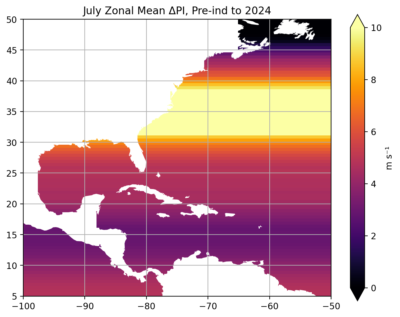 Figure 1 - Estimated zonally-averaged change in July potential intensity from pre-industrial to present day expressed in terms of hurricane sustained maximum wind speed. |
