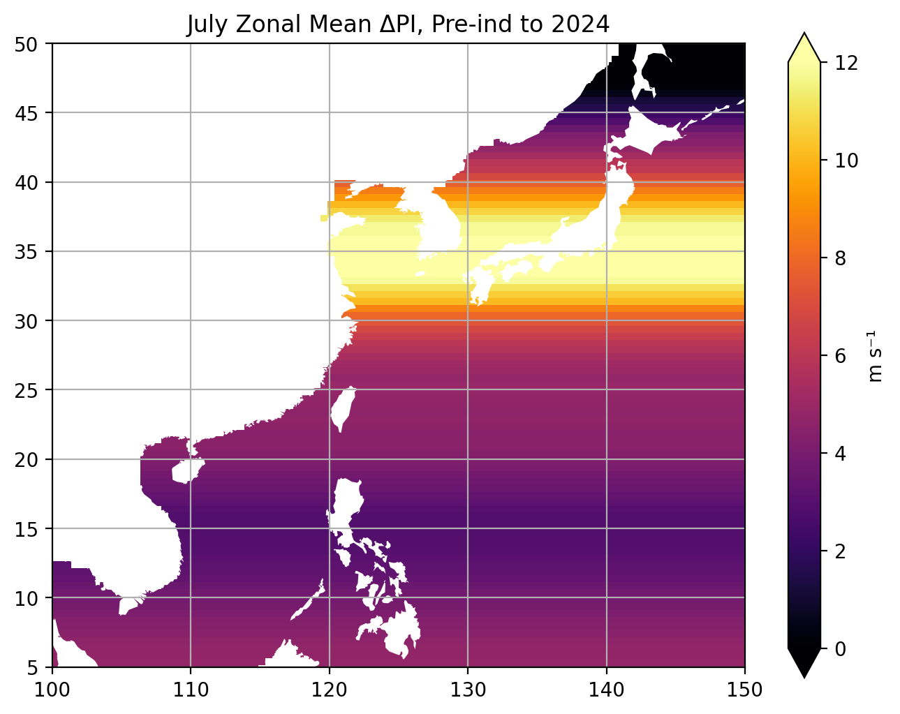 Figure 1 - Estimated zonally-averaged change in July potential intensity from pre-industrial to present day expressed in terms of typhoon sustained maximum wind speed. |