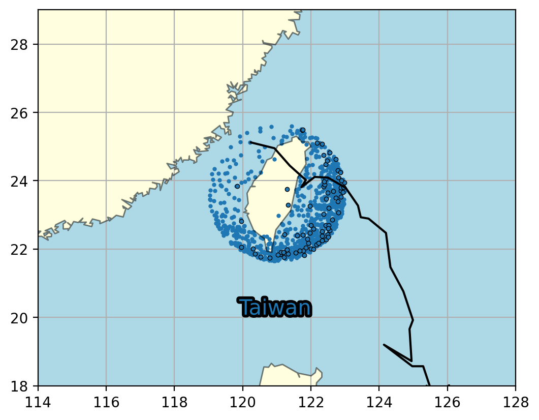 Figure 2 - Events contributing to the attribution analysis. Black circles show the location of the maximum intensity of tracks of observed typhoons in the vicinity of Taiwan. Blue dots show the same for a sample of tracks simulated by IRIS. The black line shows the observed path of Typhoon Gaemi. |