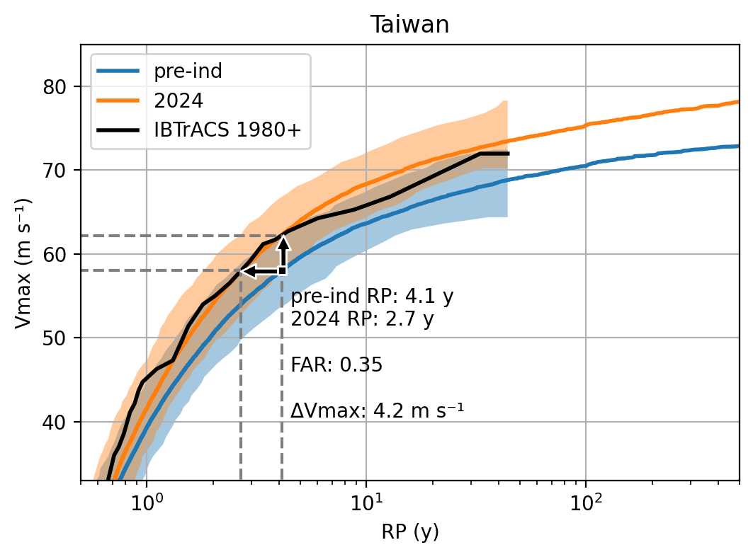 The intensity of a Gaemi type event, at the first approach, was increased by about 4 m/s or 7% (Figure 3). From this we can also determine that the likelihood of this type of event near Taiwan has changed from an event expected on average about once every 4 years to once every 3 years (Figure 3). Typhoons reaching Taiwan like Gaemi have become about 50% more likely due to human-caused climate change.