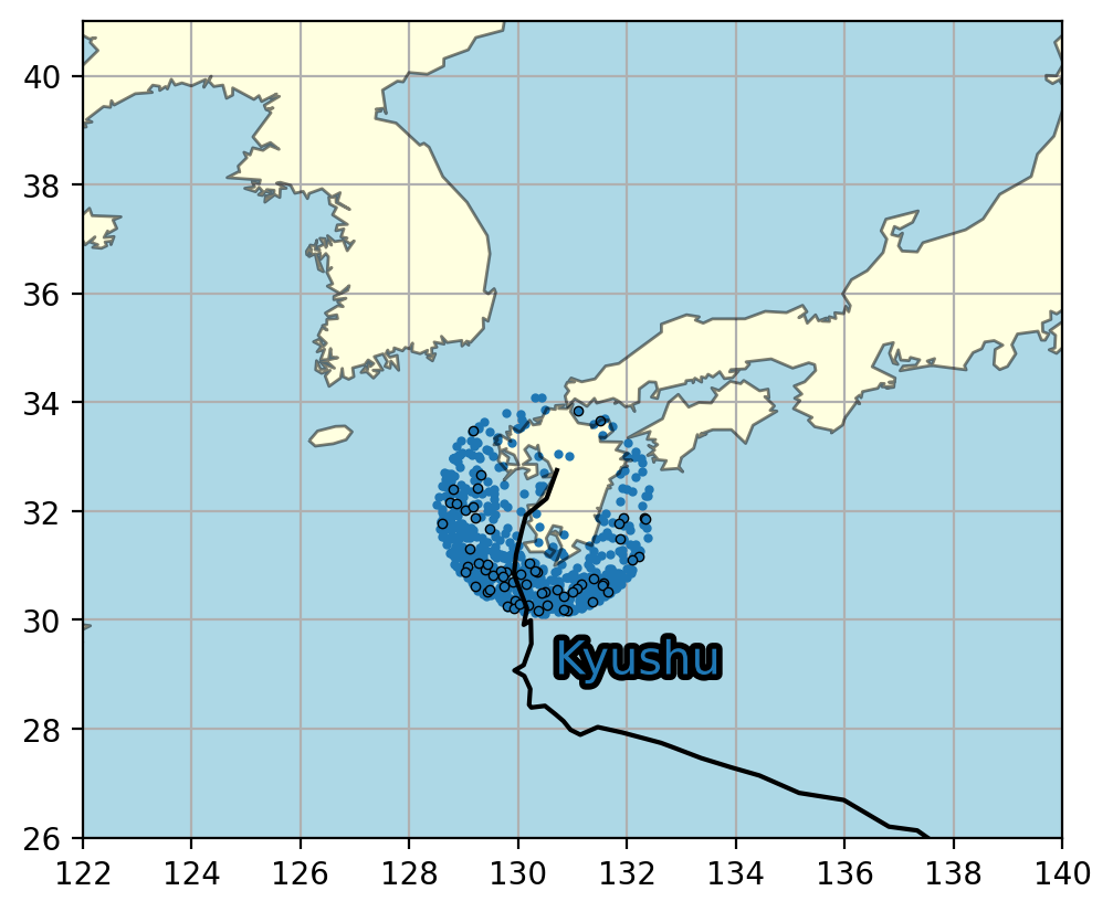 Figure 2 - Events contributing to the attribution analysis. Black circles show the location of the maximum intensity of tracks of observed typhoons in the vicinity of Kyushu. Blue dots show the same for a sample of tracks simulated by IRIS. The black line shows the observed path of Typhoon Shanshan. |