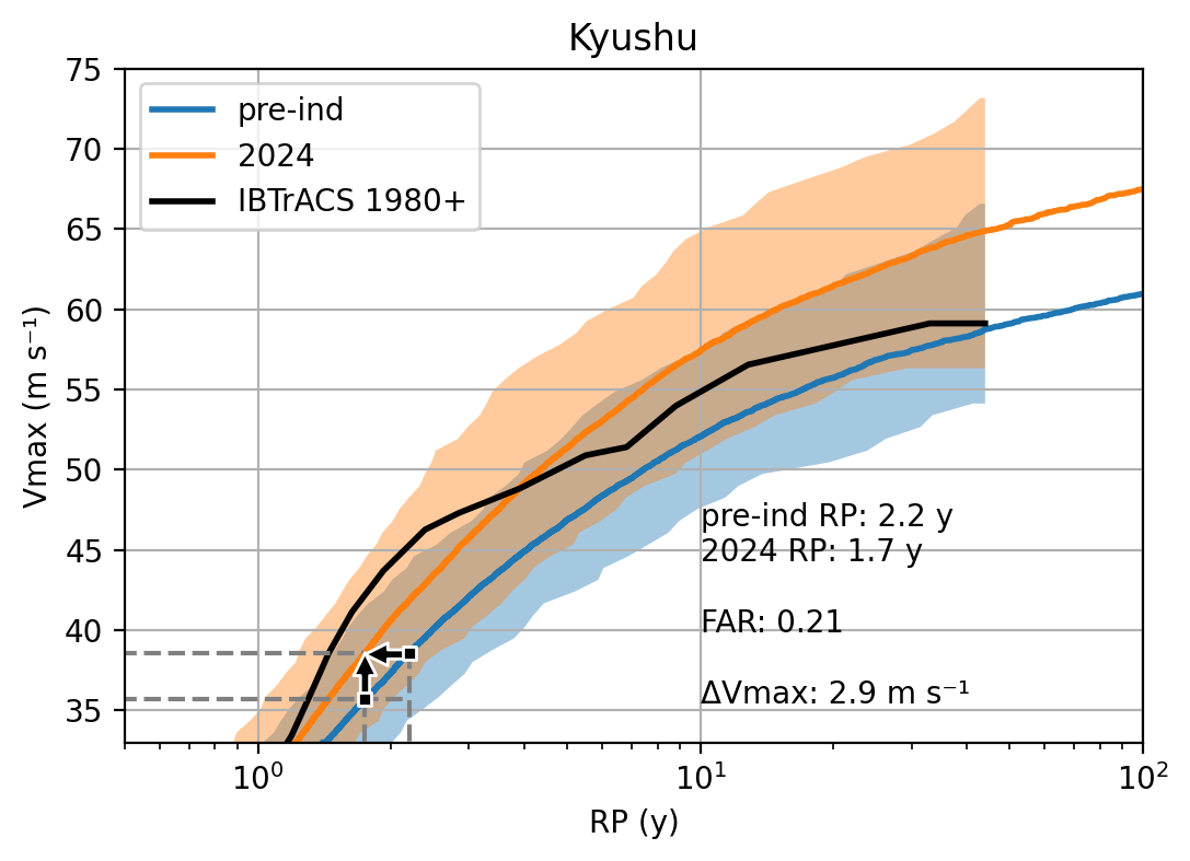 Figure 3 - Return curves for hurricanes passing close to Kyushu. IRIS pre-industrial and present-day simulations shown in blue and orange respectively, observations are in black (1980-2023). The shading shows range of sampling uncertainty of 44-year samples of IRIS simulations. |