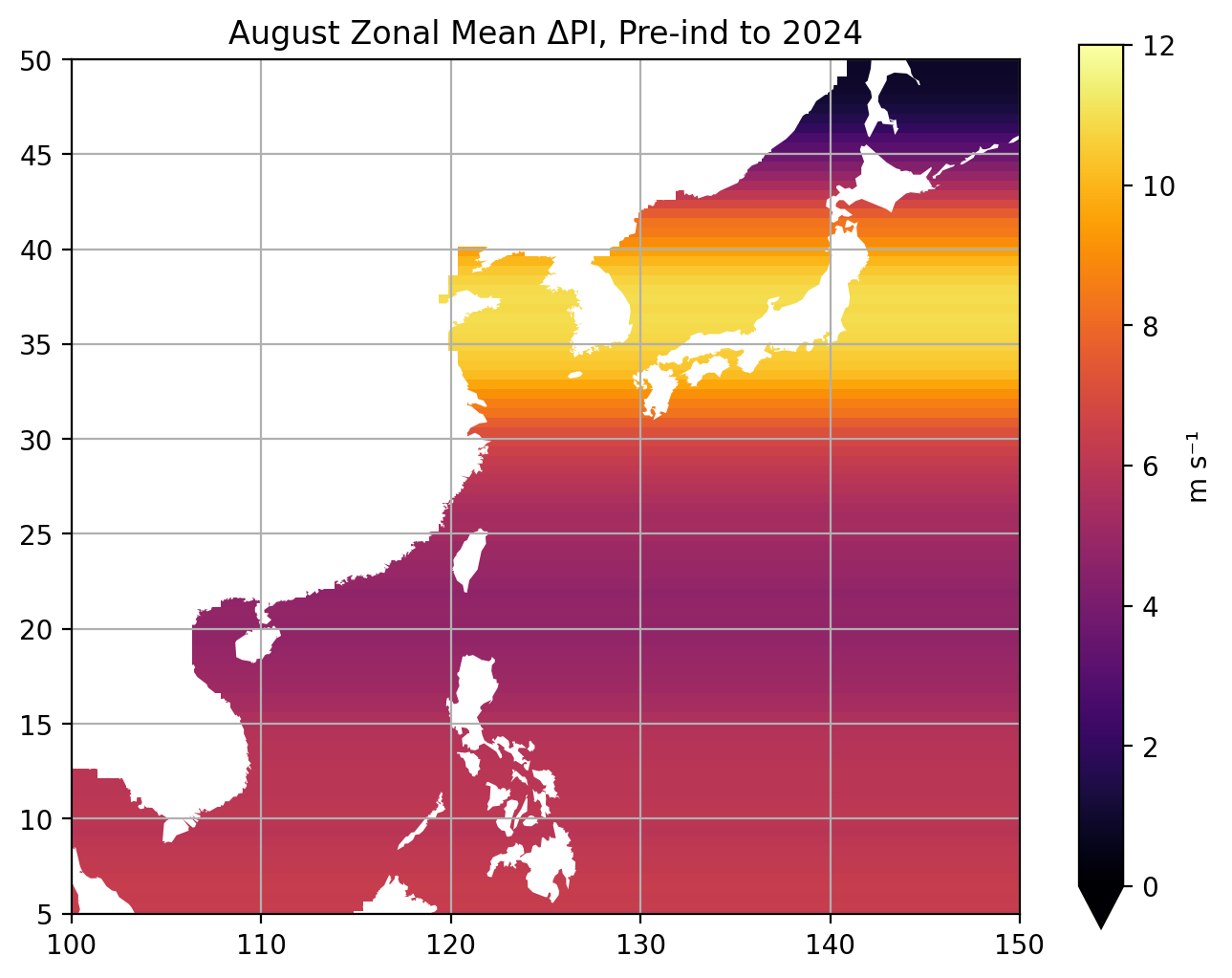 Figure 1 - Estimated zonally-averaged change in August potential intensity from pre-industrial to present day expressed in terms of typhoon sustained maximum wind speed. |