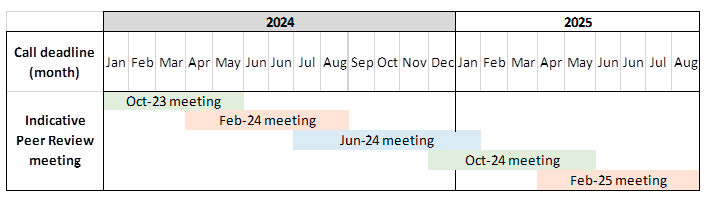 Below are the indicative peer review meeting dates for a given call deadline (by month), e.g. for a call with a deadline in Apr-24, the application form should be submitted for the Feb-24 Peer Review meeting (if you missed the Oct-23 meeting). For a call with a Jul-24 deadline, two Peer Review meeting options are given. We would always recommend to submit as early as possible. I hope this makes sense and is useful.