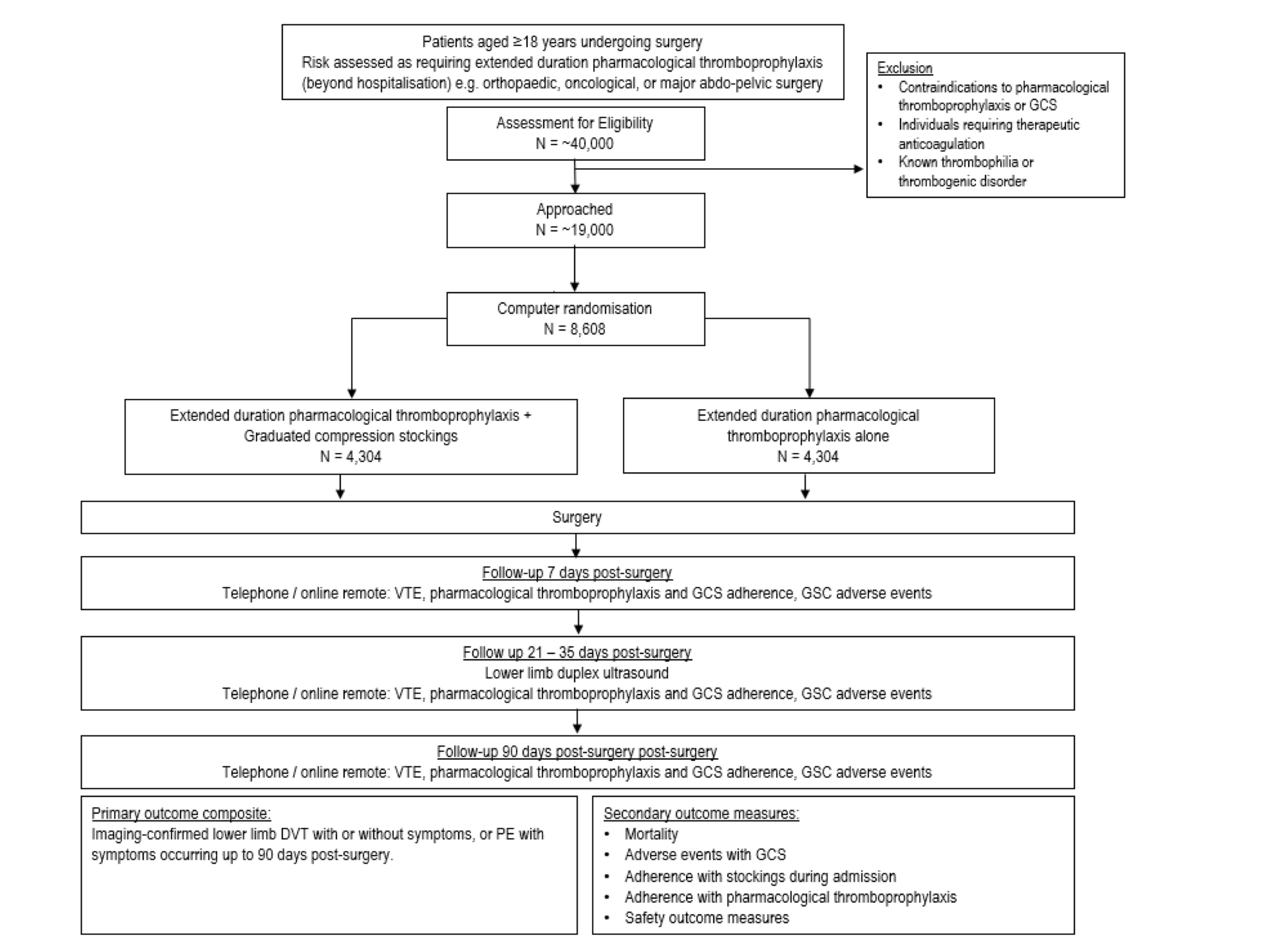 There is currently no high-quality evidence to support the use of GCS in addition to EDPTP in patients deemed to be at the highest risk of VTE. A Cochrane Review which reported benefit for GCS included small trials (18-440 patients) only one of which was published this millennium, and many of these trials were funded by stocking manufacturers. Additionally, two large recent trials were excluded from this review in stroke and orthopaedic patients - neither study supported the use of GCS. Furthermore, the NIHR GAPS trial reported that pharmacological thromboprophylaxis alone is non-inferior to pharmacological thromboprophylaxis and GCS. This proposal includes individuals requiring EDPTP, at highest risk, who were excluded from GAPS, hence the results cannot be directly extrapolated. In preparation for this study, a systematic review and meta-analysis of VTE rates in surgical patients treated with pharmacological thromboprophylaxis in addition to GCS in comparison to pharmacological thromboprophylaxis alone was undertaken in accordance with PRISMA guidelines. Overall, the additional benefit of GCS is not clear based on existing data.